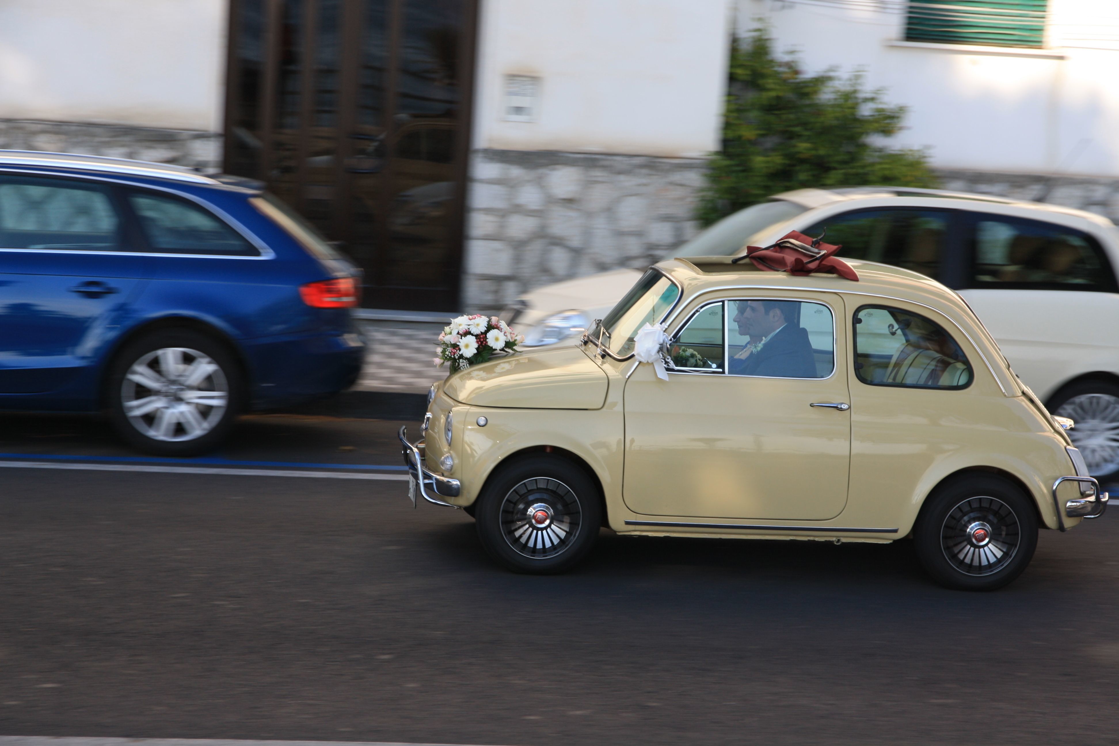 I shot this off as I spotted this car coming down the main street in Minori (Coast Amalfi) - a bride on her way to the wedding in the perfect car for those roads, an original Fiat 500.