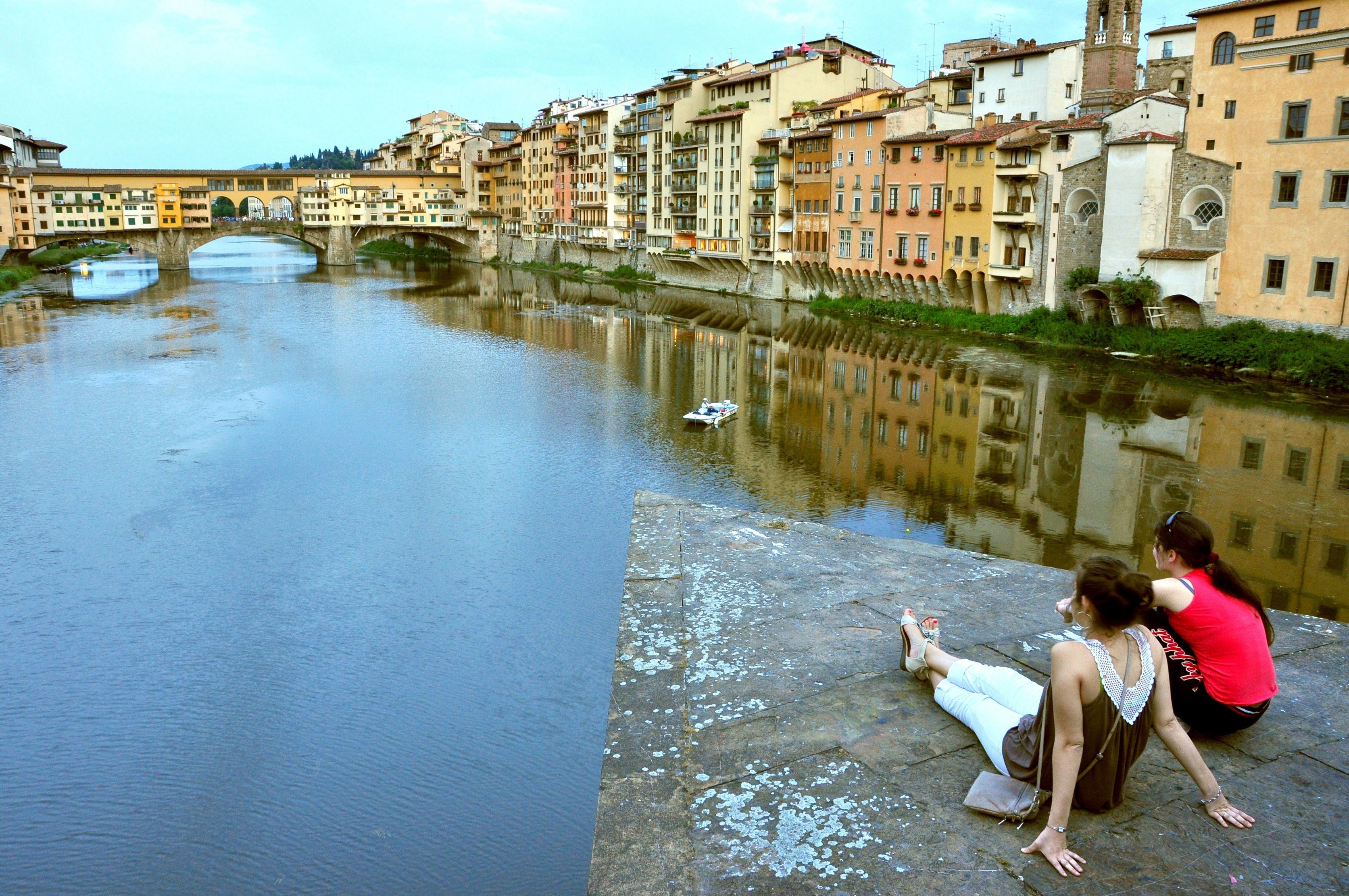 due amiche a Firenze guardano il Ponte Vecchio e il fiume Arno in una sera d'estate