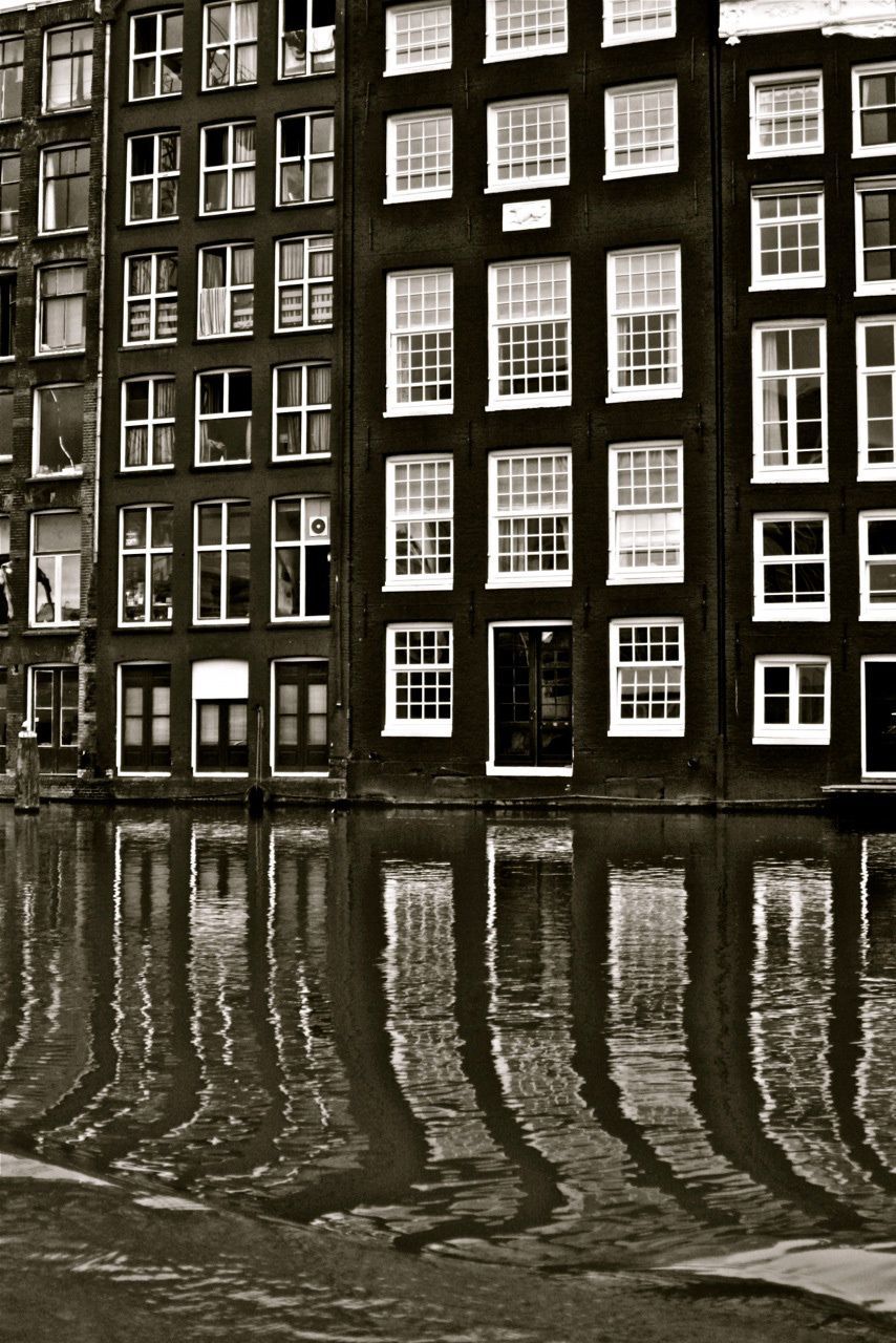 Boat trip on the channels of Amsterdam, buildings seems to melt in the water
