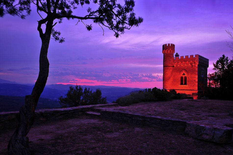 Purple Sunset at Rennes-le-Chateau in Languedoc, France, and the mythical Tour Magdala. A must-see location for anyone interested in the hisyory of Knights Templar and the Cathars...