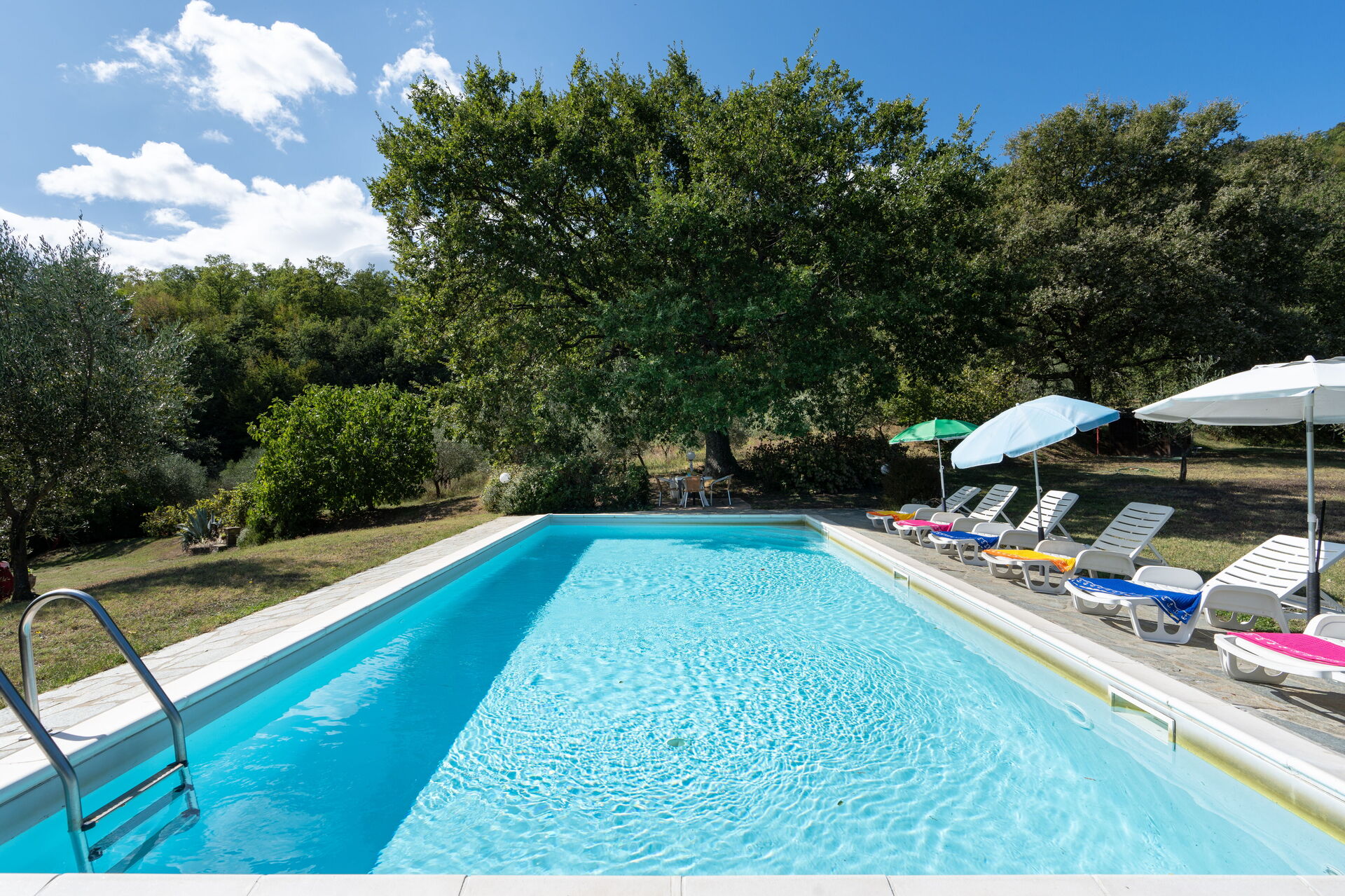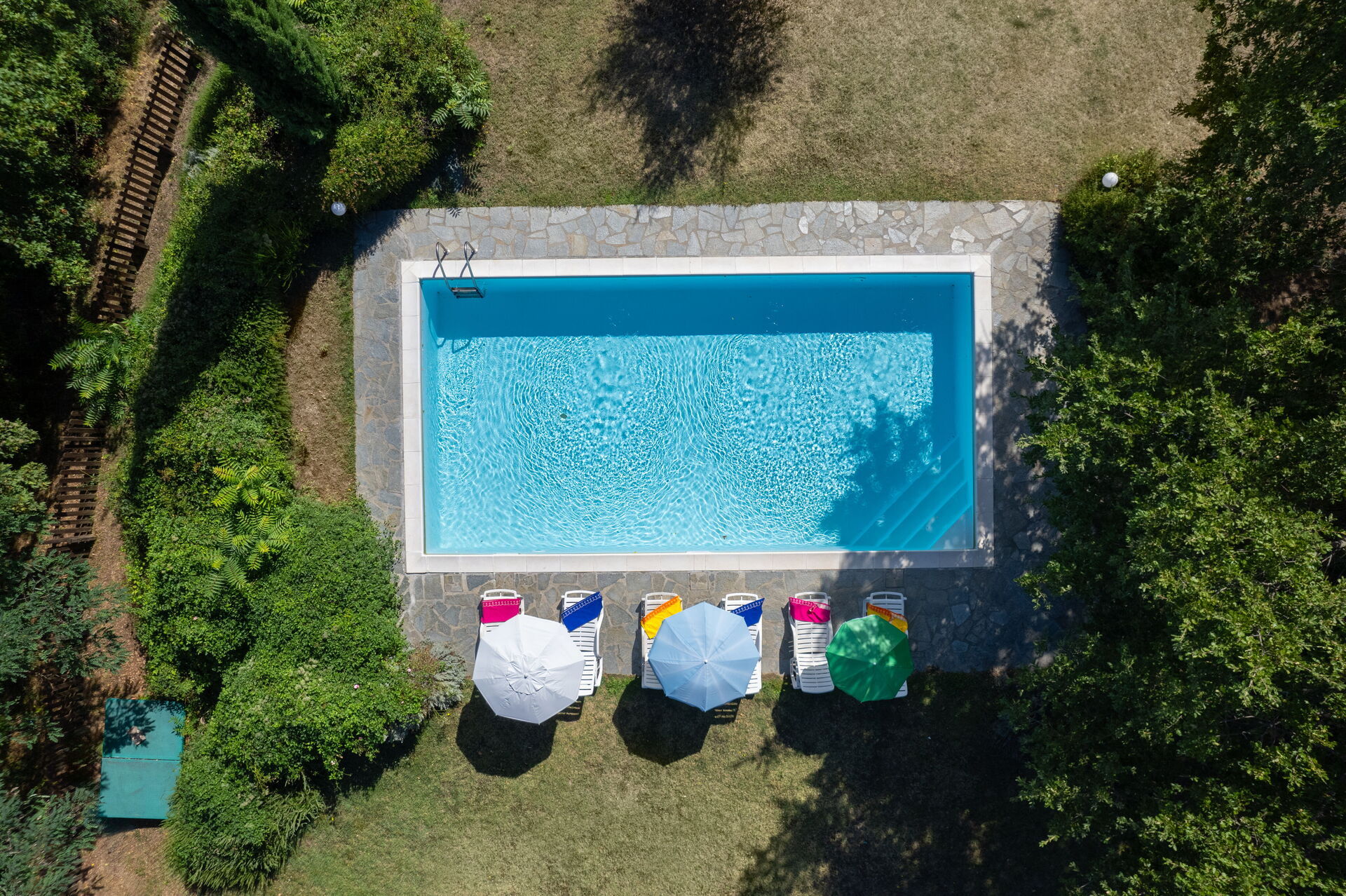 Giardino (3000 m2): piscina (privato/a, larghezza: 5m, lunghezza: 10m, profondità: 1.4m, esterno/a), arredamento da giardino, sdraio.
