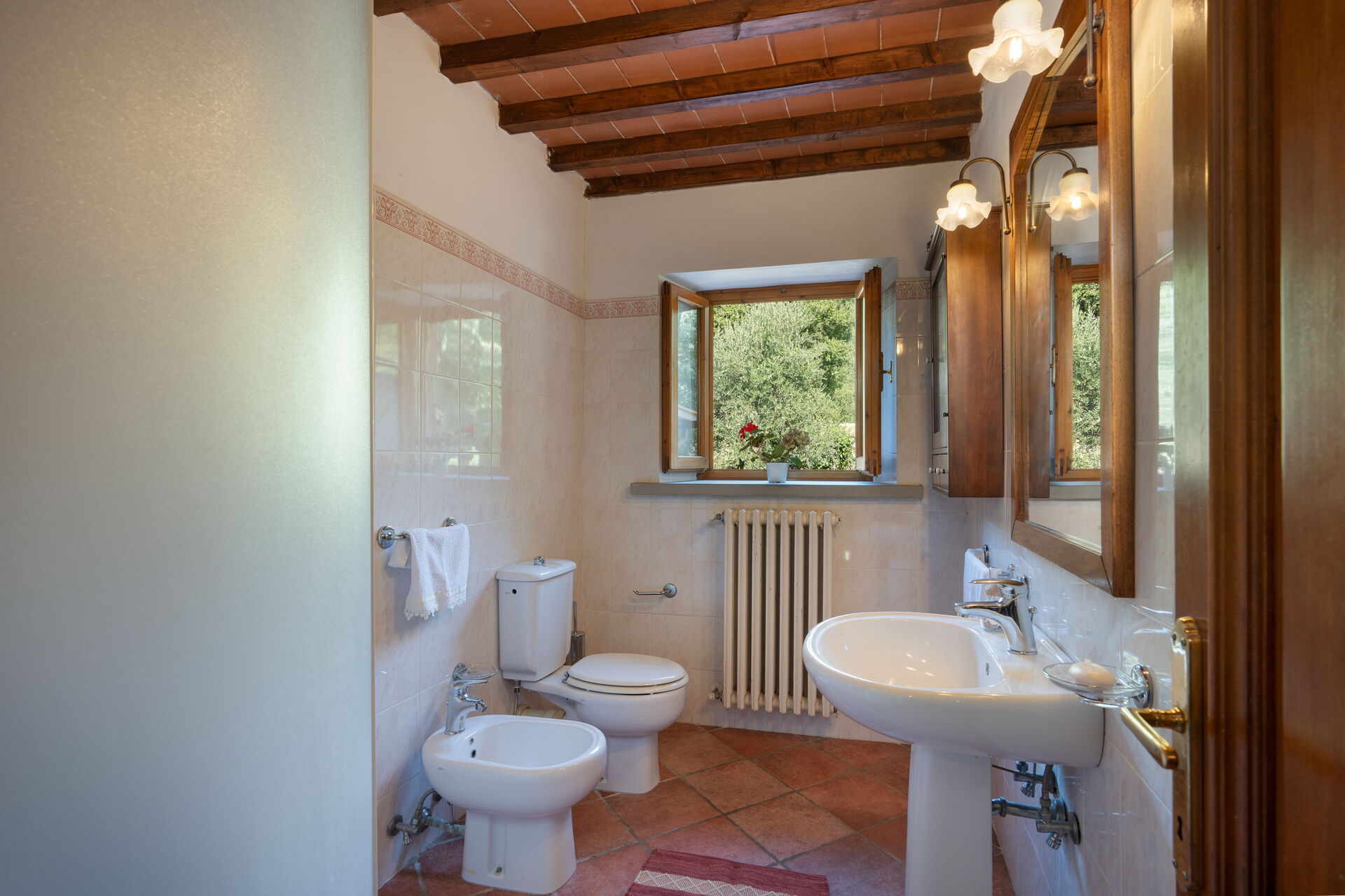 Bagno: lavandino, wc, bidet, doccia.