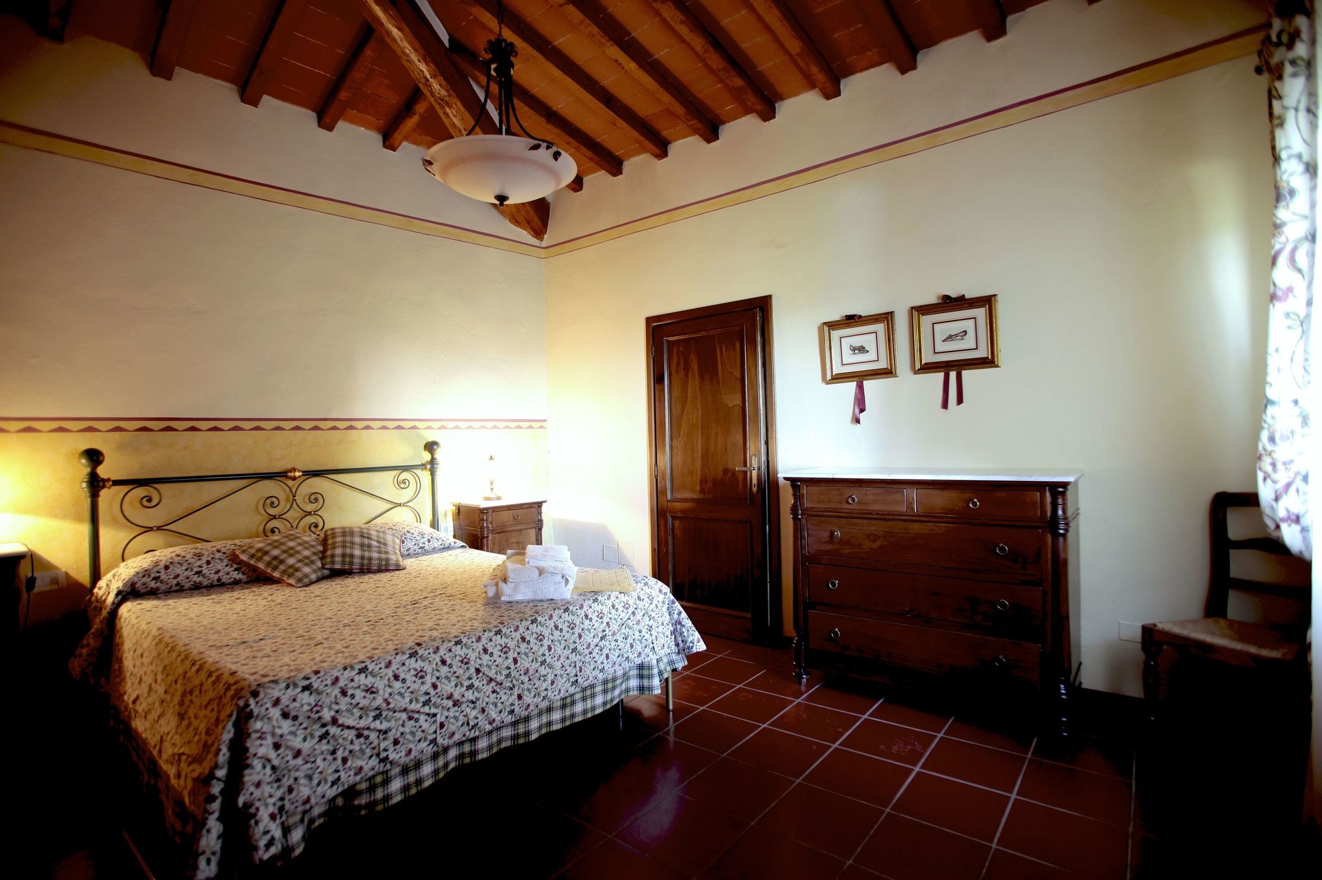 Sviluppata su due livelli, Casa Gialla è composta da un soggiorno/sala da pranzo con vetrate, cucina separata, due camere matrimoniali e una doppia, più tre bagni, due solo con doccia e uno con doccia e vasca.