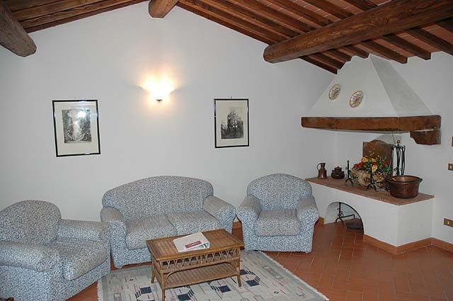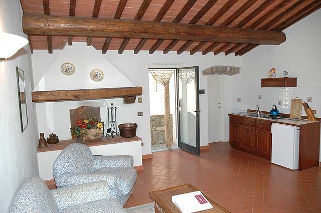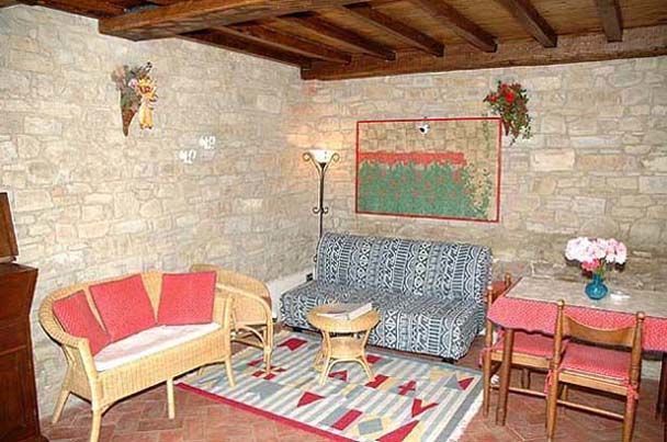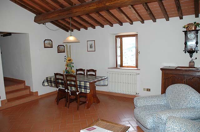 Piano terreno rialzato: soggiorno con divano letto singolo, angolo cottura (freezer) e zona pranzo, camera matrimoniale, bagno con doccia.