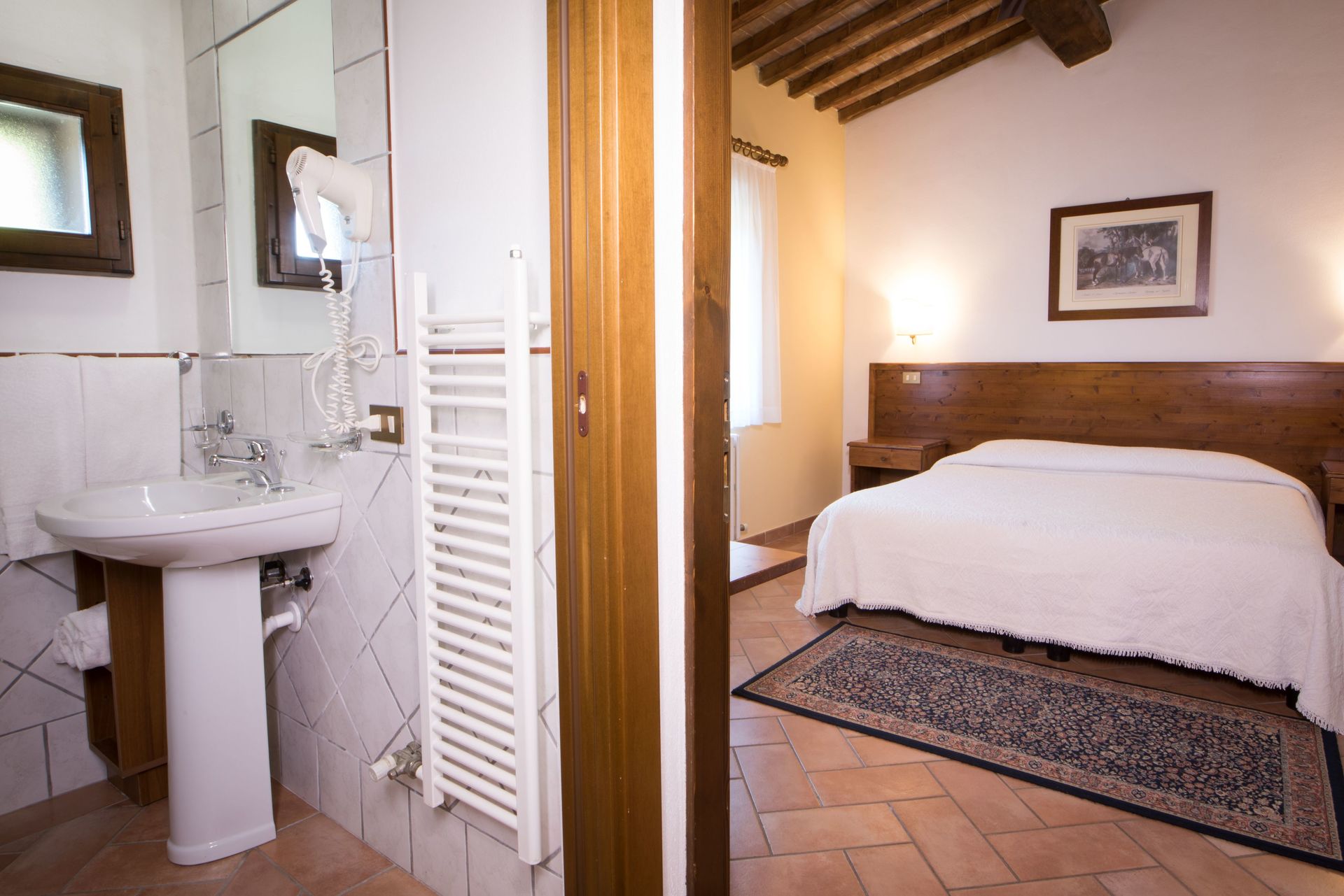 Bagno (3 m2): lavandino, wc, bidet, doccia, asciugacapelli, zanzariere.