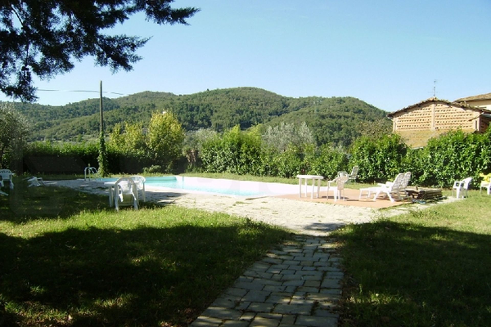 Giardino (500 m2): piscina (larghezza: 6m, lunghezza: 14m, profondità: 1.8m), arredamento da giardino.