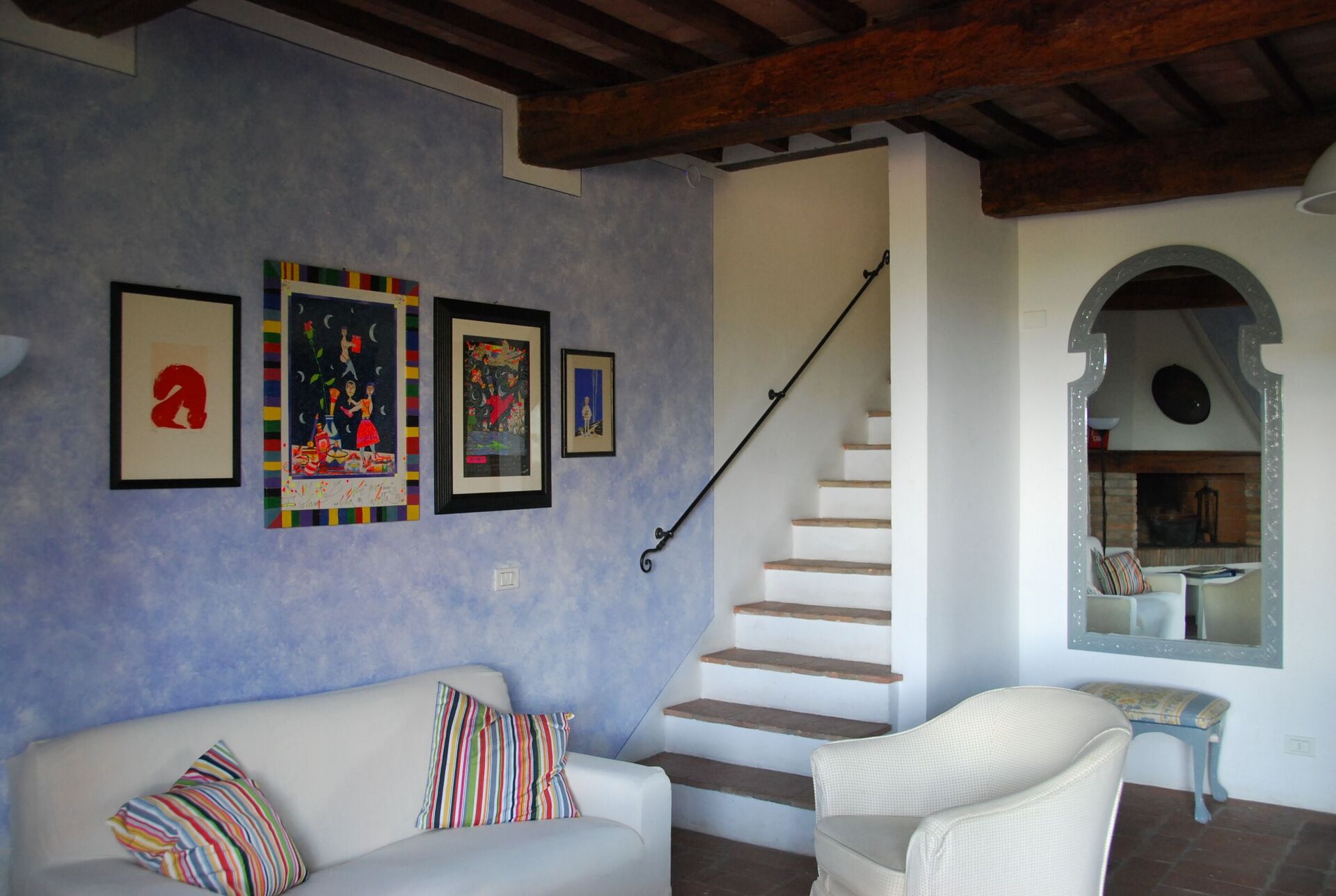 Cucina - soggiorno: cucina ben attrezzata, tavolo da pranzo, lavastoviglie, frigo, freezer, piano cottura, forno, divano, caminetto, divano letto, internet WIFI, uscita sul giardino.