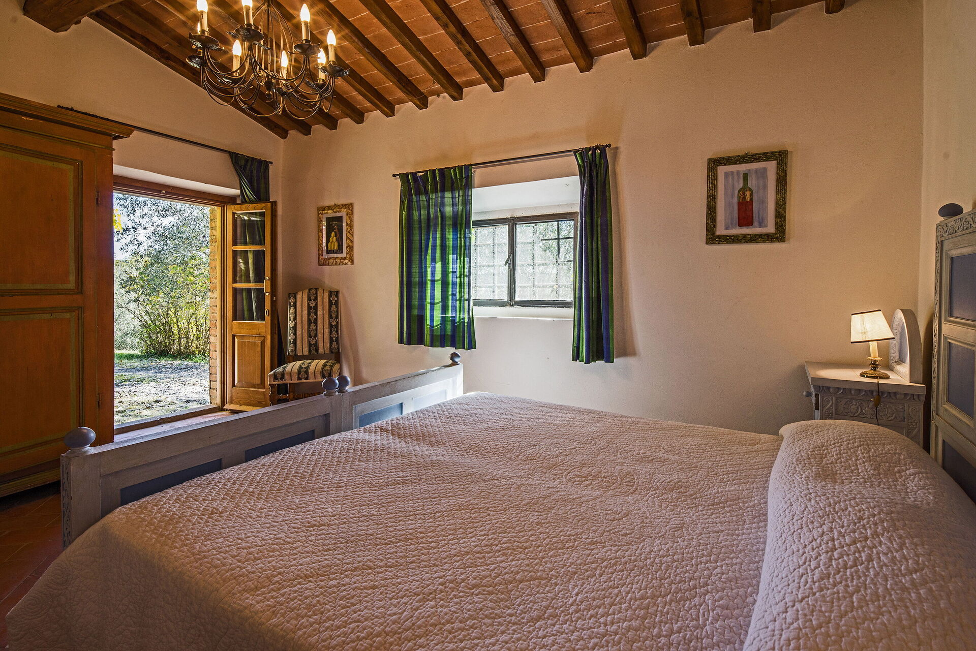 Camera da letto 1: letto matrimoniale, zanzariere, uscita sul giardino.