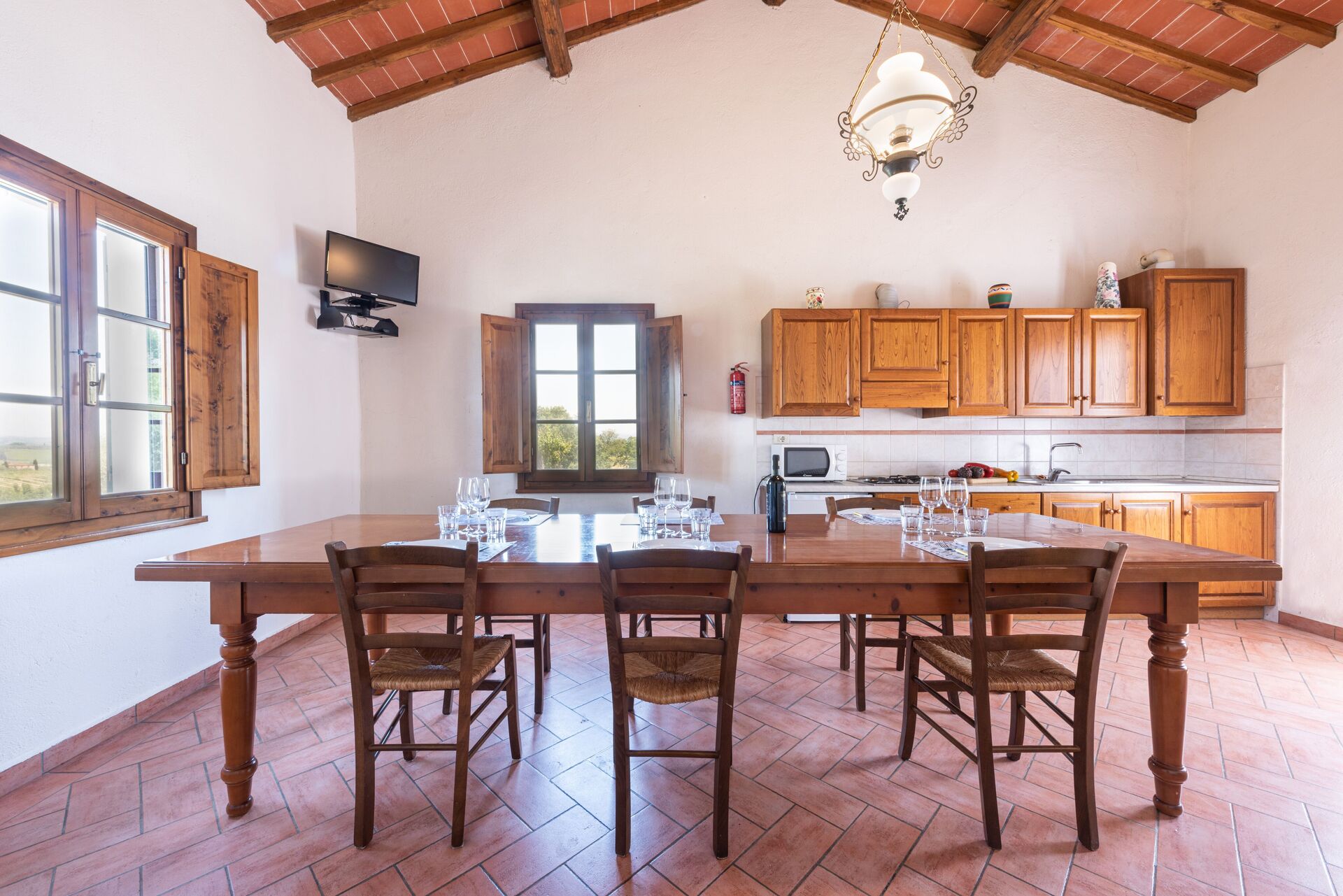 All'arrivo troverai una elegante casa vacanze pulita e in ottime condizioni con vista sulle colline, perfetta per una tranquilla vacanza in Toscana. Dopo una frenetica giornata ricca di visite ai musei locali, concediti del tempo con famiglia e amici a bordo piscina per gustarti una bibita rinfrescante o un buon calice di vino - non c'è niente di meglio per riposarti alla fine della giornata. Pranzare o cenare in compagnia di famiglia e amici è un grande aspetto della cultura toscana. Approfitta della cucina per preparare pasti utilizzando prodotti locali freschi e genuini mentre ti trovi in vacanza. La cucina è provvista di macchinetta del caffè, microonde e frigorifero, così come un numero sufficiente di stoviglie e posate per un massimo di 30 persone. Pranza o cena all'aperto, il giardino completamente accessoriato è la cornice ideale per godersi del buon cibo, la compagnia della propria famiglia o gruppo di amici e il bellissimo clima toscano.