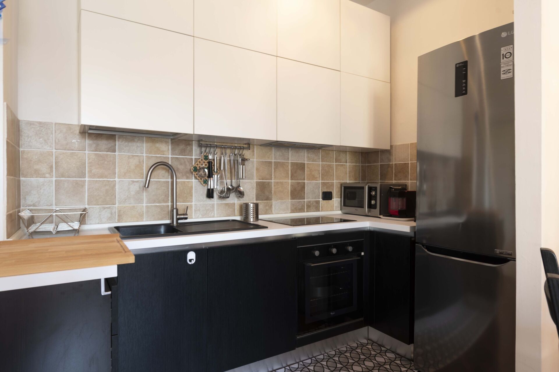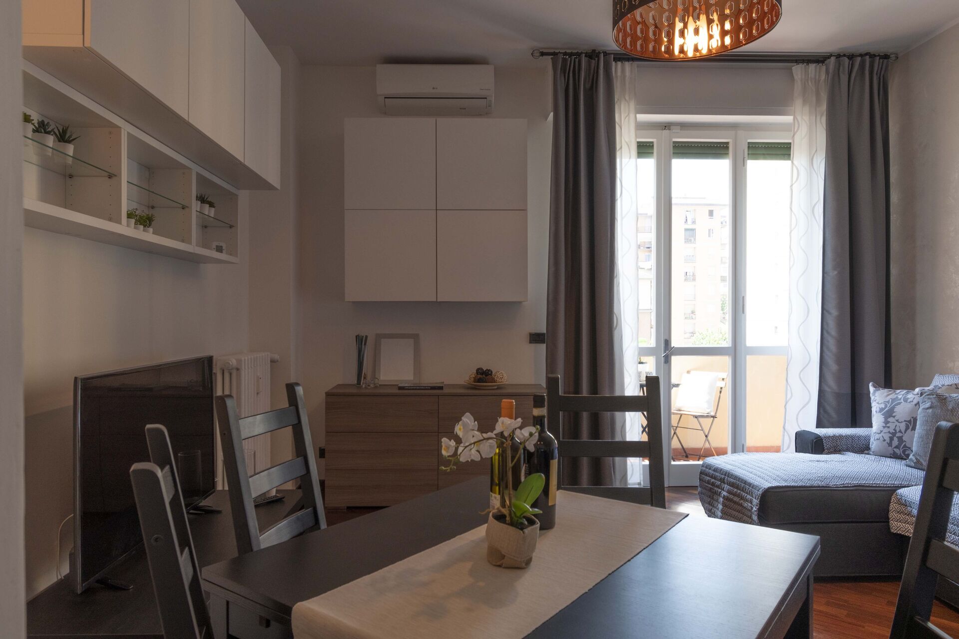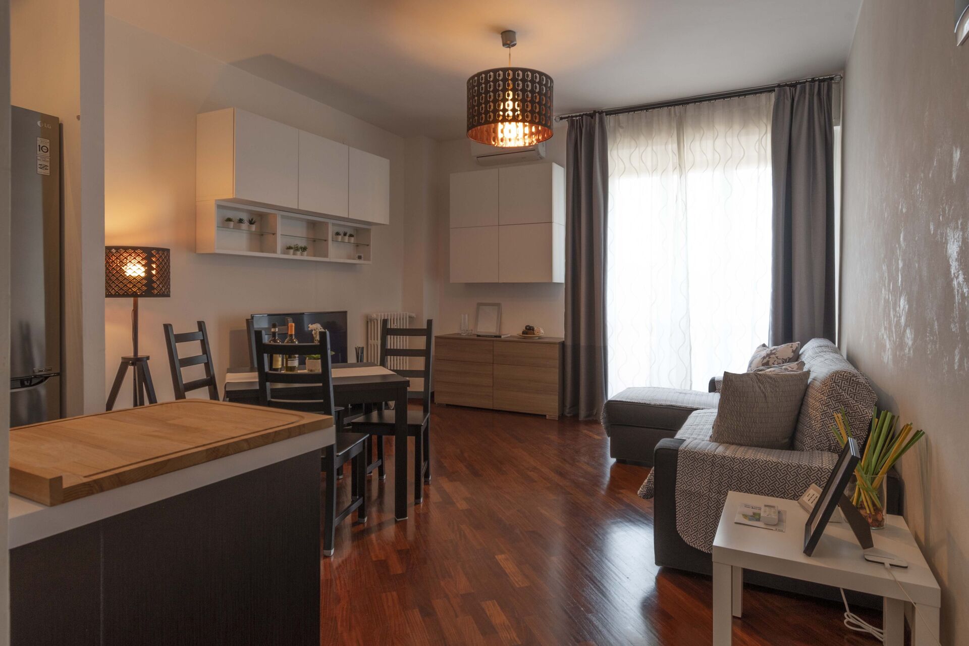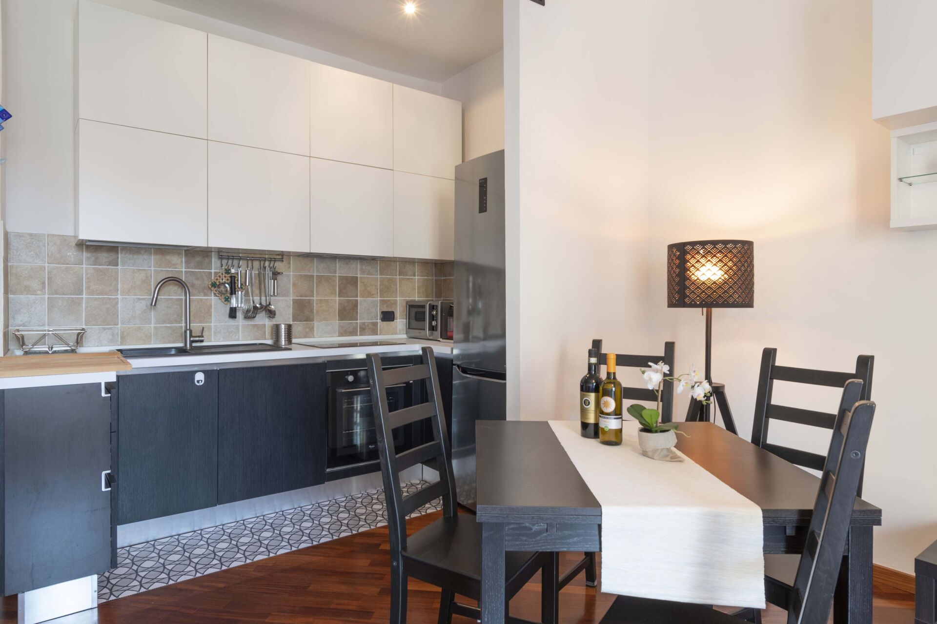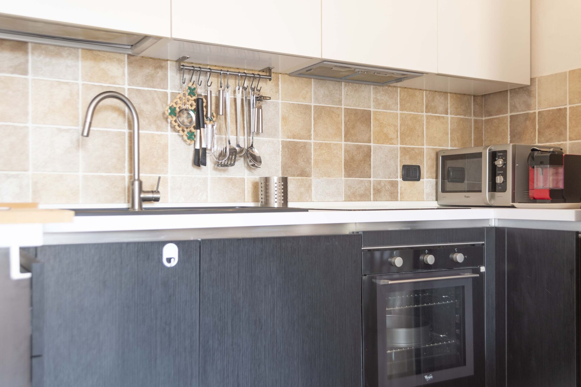Cucina - soggiorno: cucina ben attrezzata, tavolo da pranzo, lavastoviglie, frigo, freezer, microonde, piano cottura, forno, tostapane, macchina da caffè americano, divano, poltrona, scrivania, divano letto matrimoniale, internet WIFI, internet, aria condizionata, uscita sul balcone.