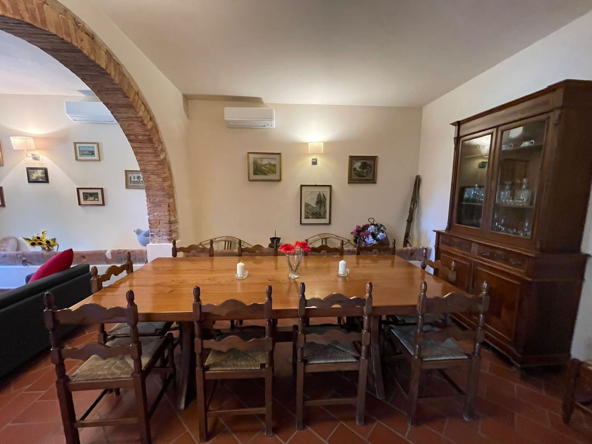 Sala da pranzo: due tavoli da pranzo (persone: 8), sette poltrone, aria condizionata, internet WIFI, televisione, caminetto, uscita sul giardino, uscita sul patio.