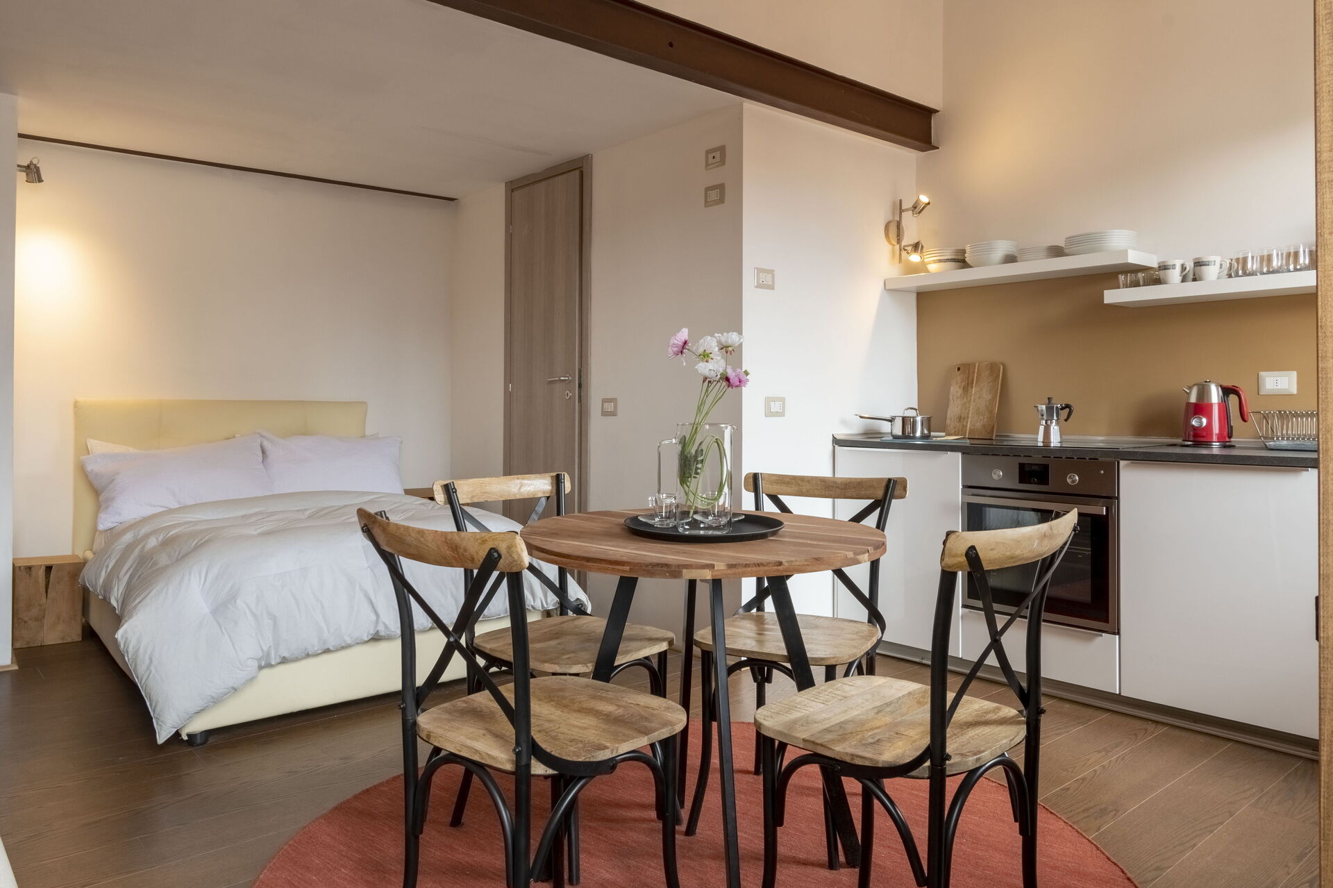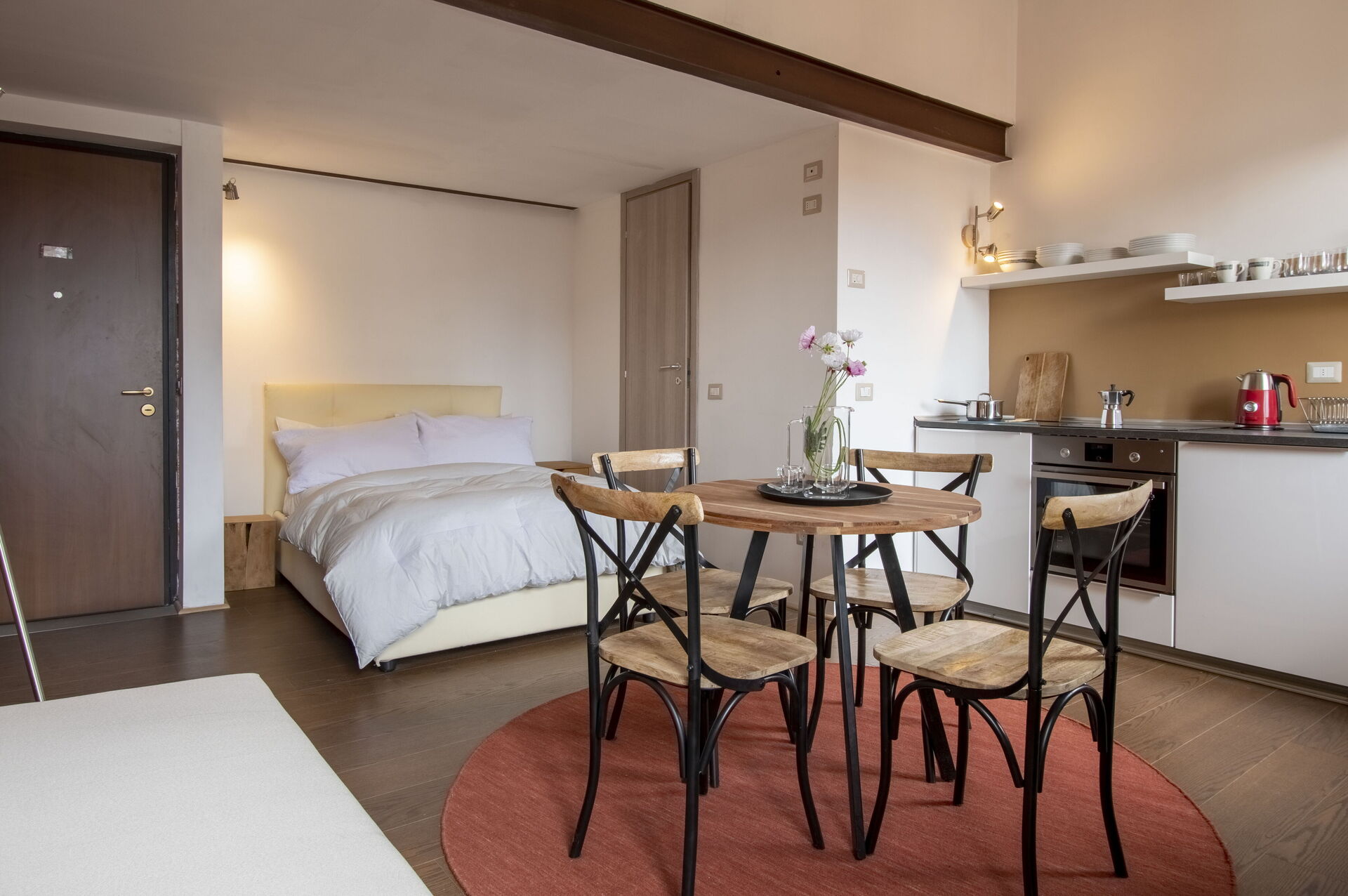 Open space: tavolo da pranzo (persone: 4), letto matrimoniale, divano letto matrimoniale, internet WIFI, aria condizionata, tv satellitare, frigo, piano cottura, freezer, lavastoviglie, cucina ben attrezzata, forno, macchina da caffè (italiana), macchina da caffè americano.