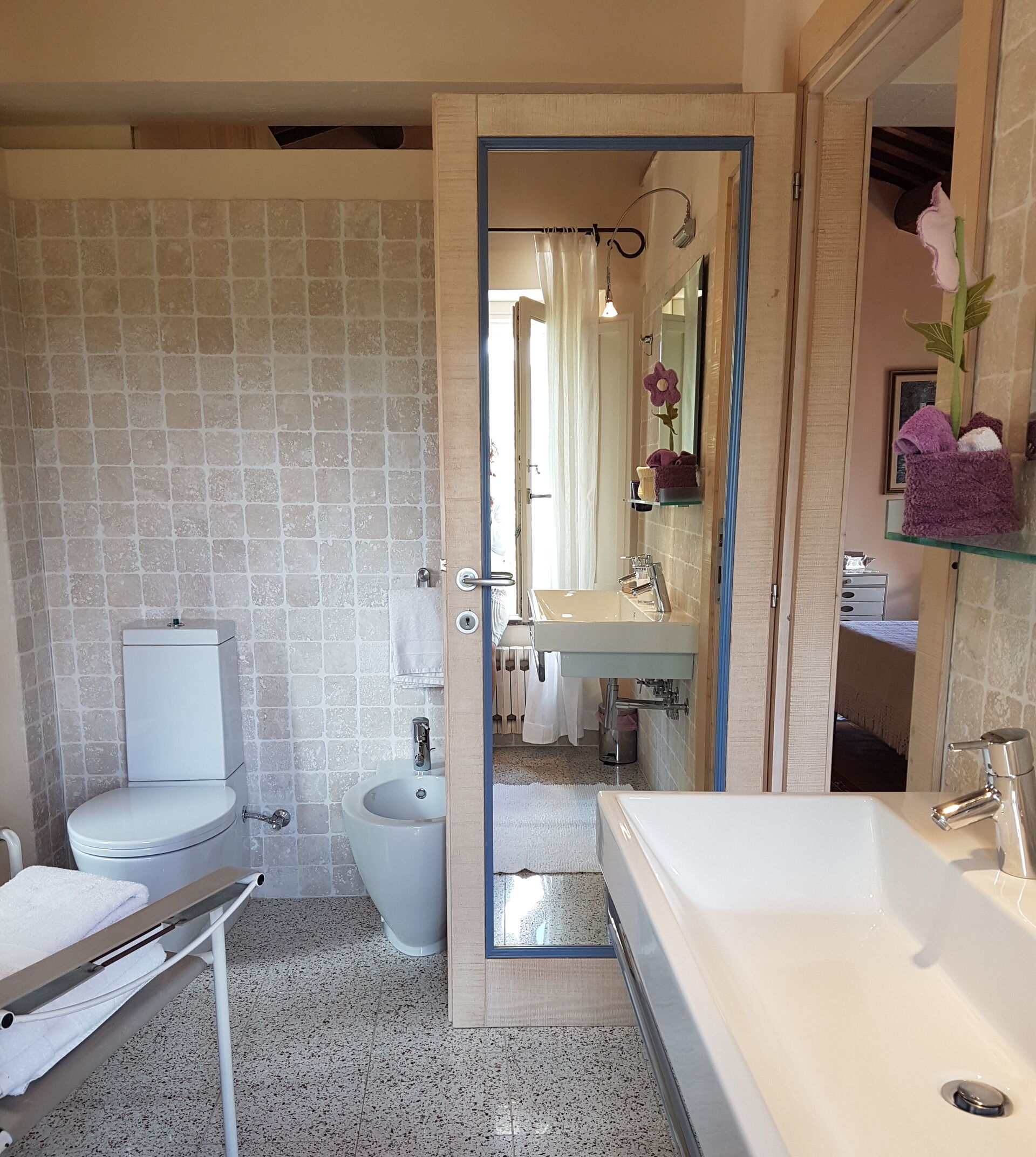 Camera da letto con bagno 1 (40 m2): due letti matrimoniali (larghezza: 170m, lunghezza: 190m), internet WIFI, aria condizionata, zanzariere, poltrona, scrivania, frigo, lavandino doppio, wc, bidet, doccia, asciugacapelli.