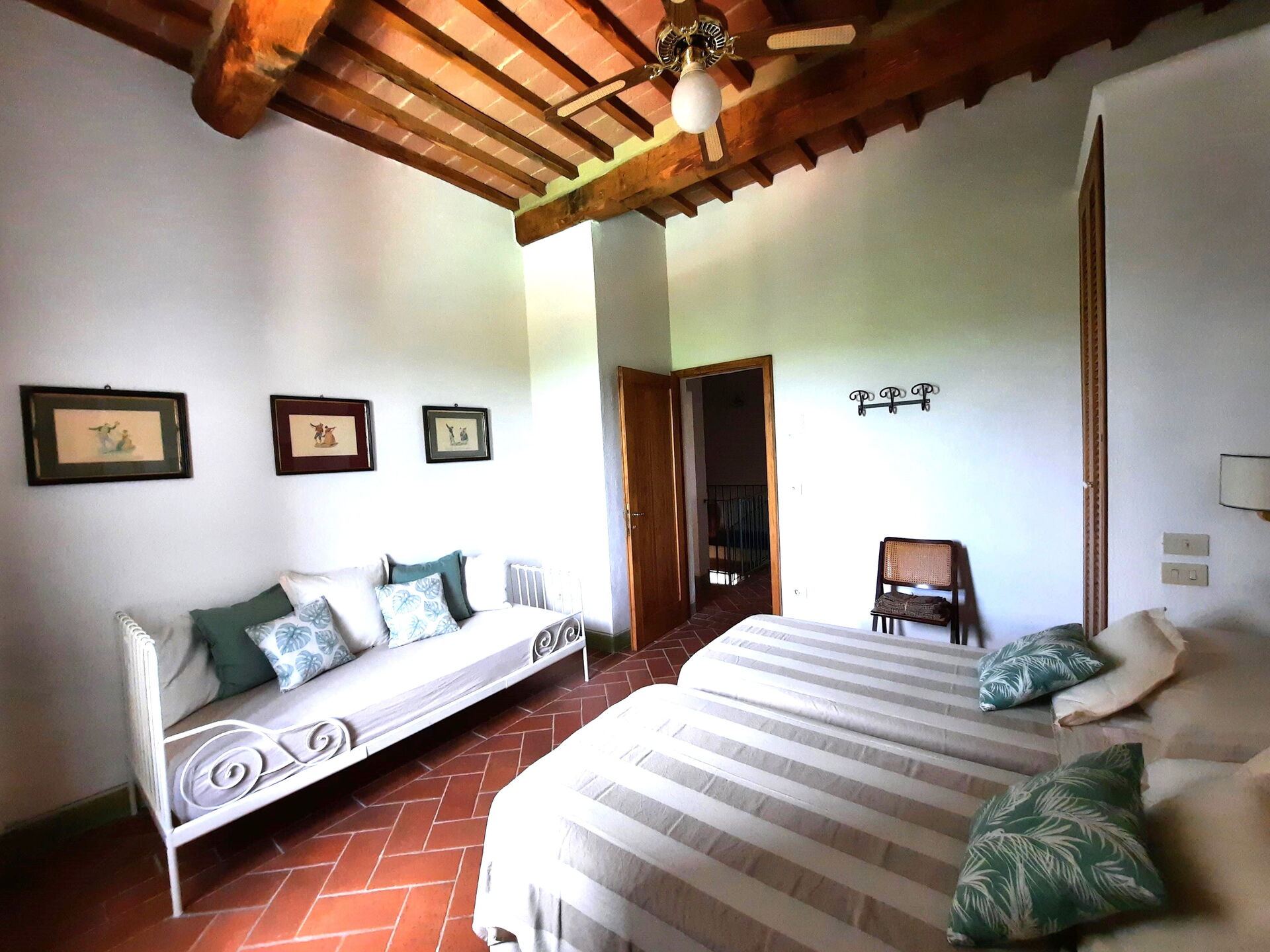 Camera da letto 3: due letti singoli (larghezza: 0.9m, lunghezza: 1.9m), divano letto (larghezza: 0.8m, lunghezza: 1.9m), internet WIFI, aria condizionata, ventilatore a soffitto, due poltrone.