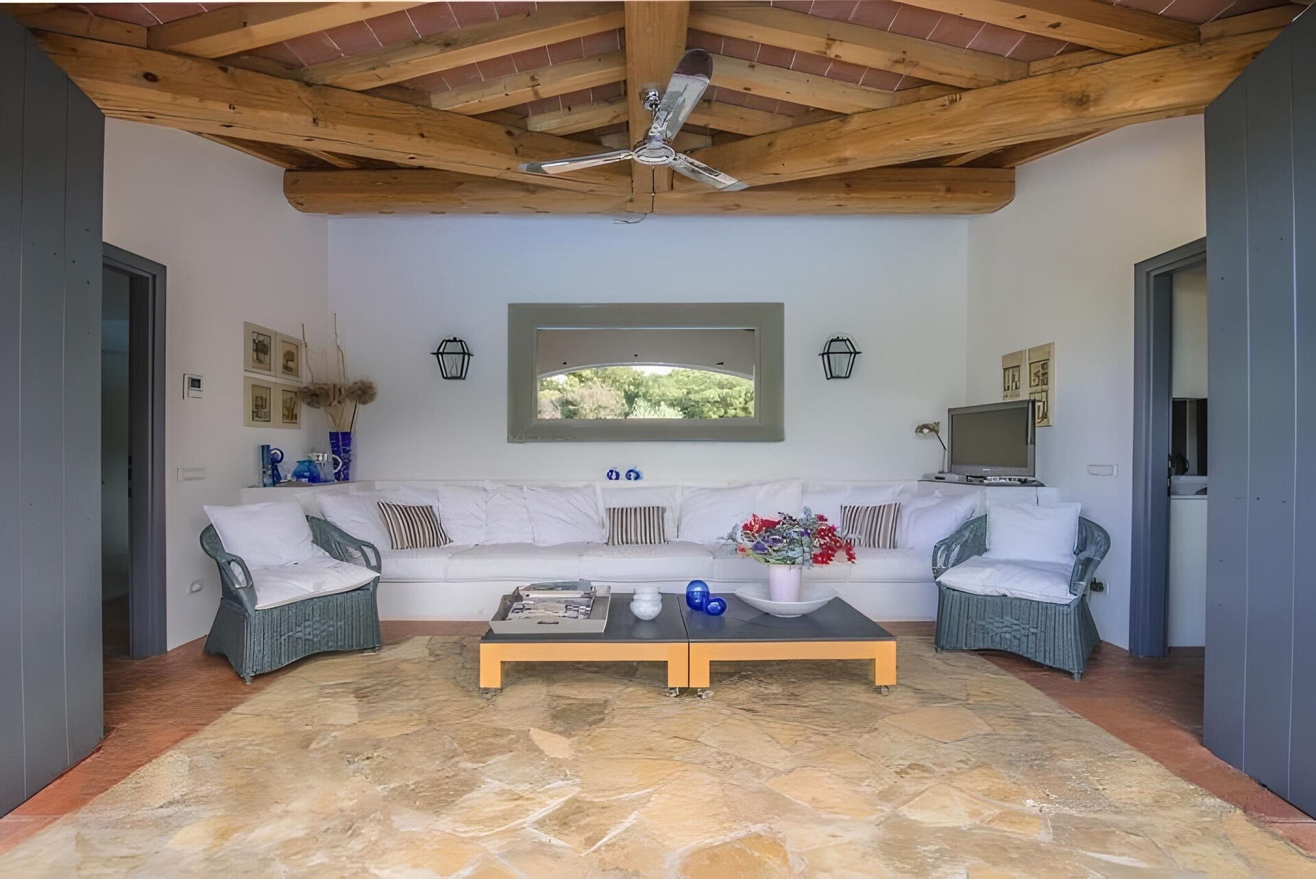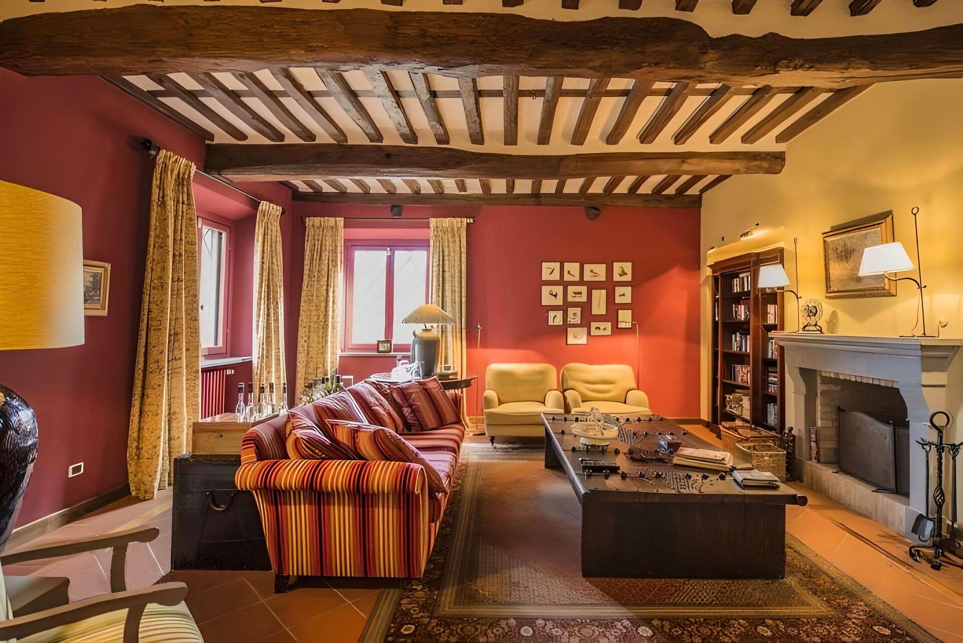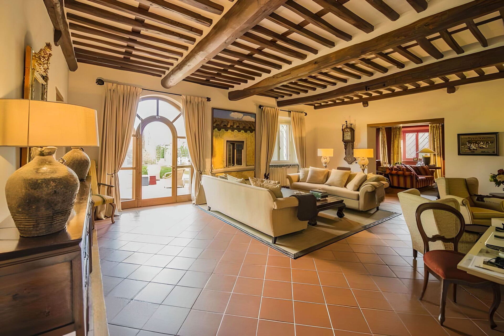 Soggiorno 1: due divani, due poltrone, scrivania, caminetto, internet WIFI, uscita sul giardino, uscita sul patio.