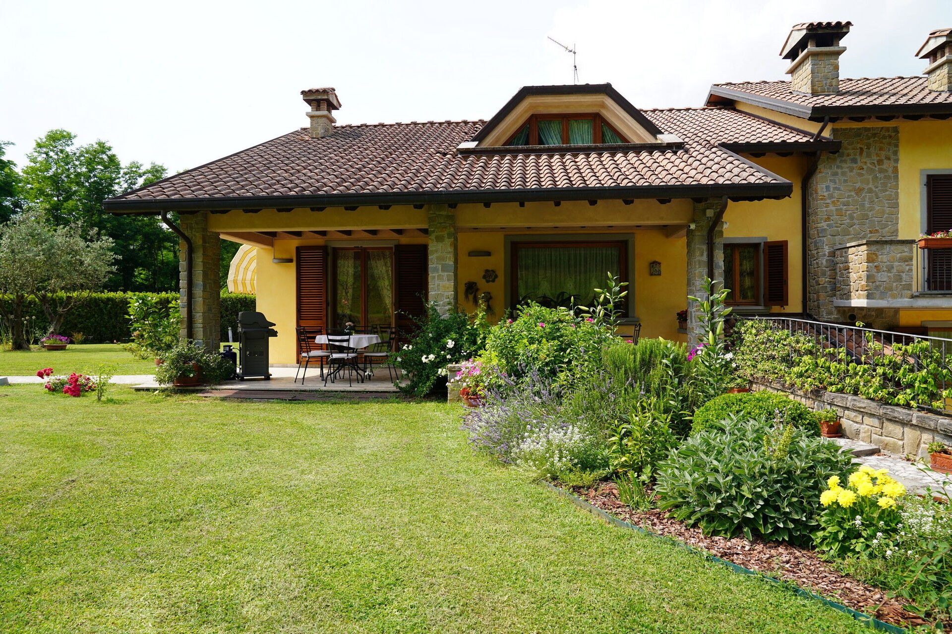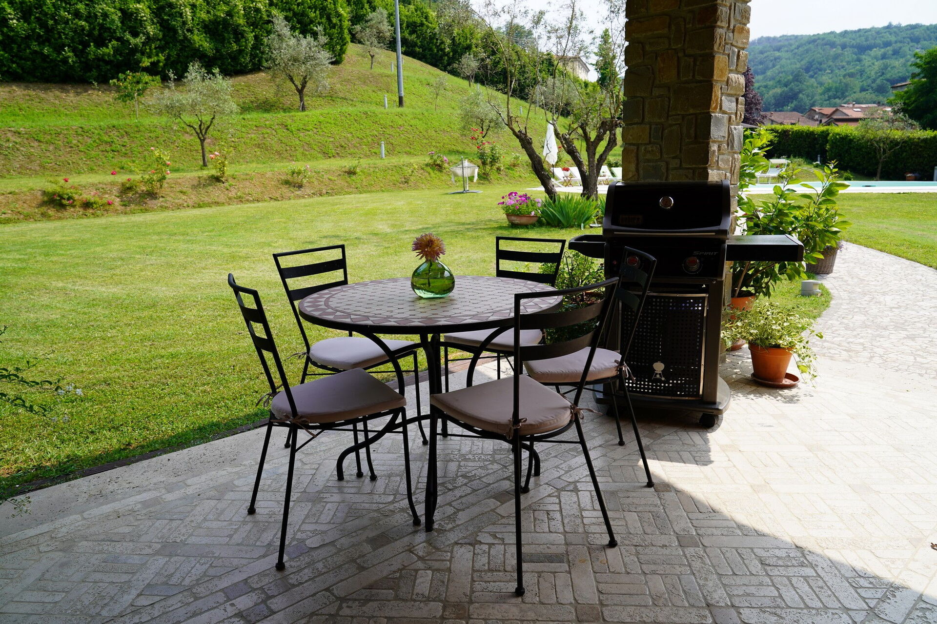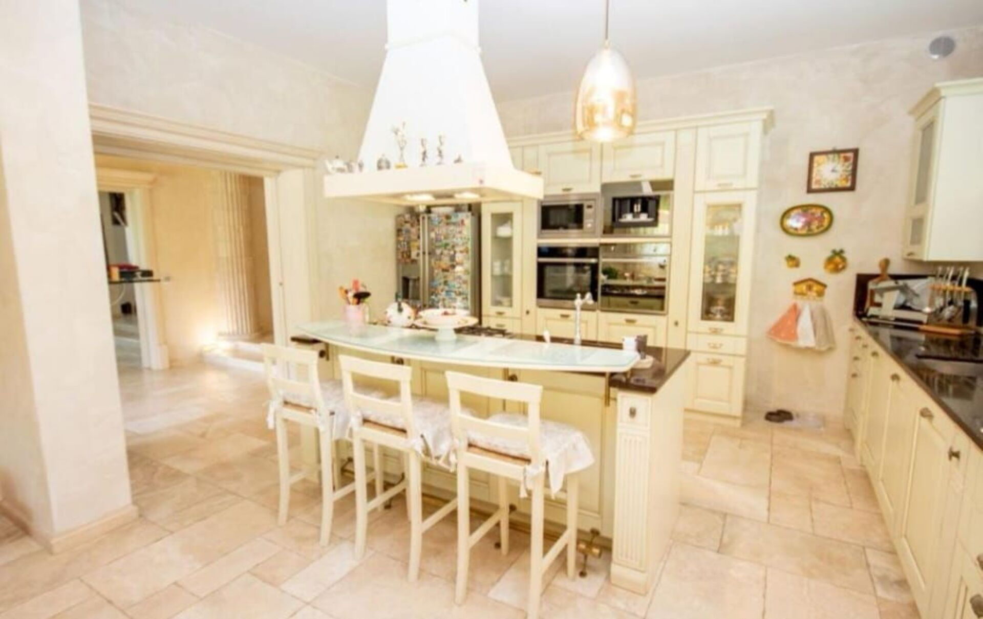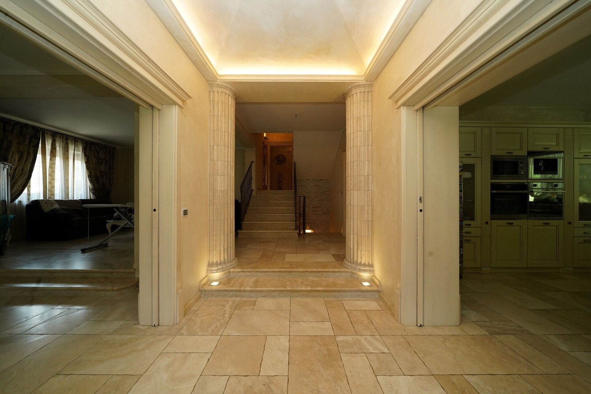 Intorno al piano terra c'è un grande pergolato con varie aree di seduta. Dall'ingresso (pavimenti in marmo, parquet con riscaldamento a pavimento nelle camere da letto) si accede alla cucina ben attrezzata sulla destra (macchina automatica per caffè espresso, forno, grill, lavastoviglie, doppio frigorifero), bar per la colazione e sala da pranzo (aperta).