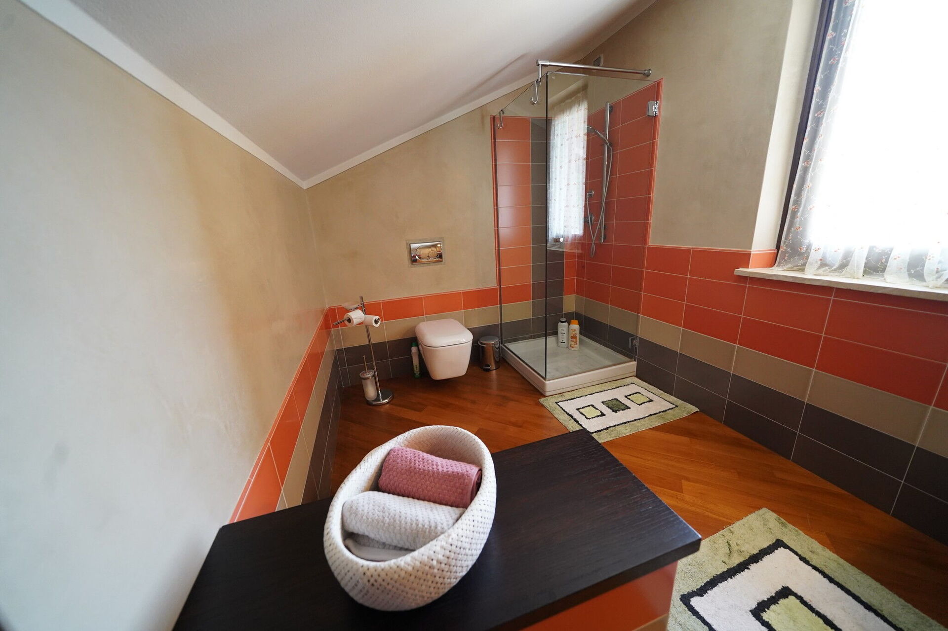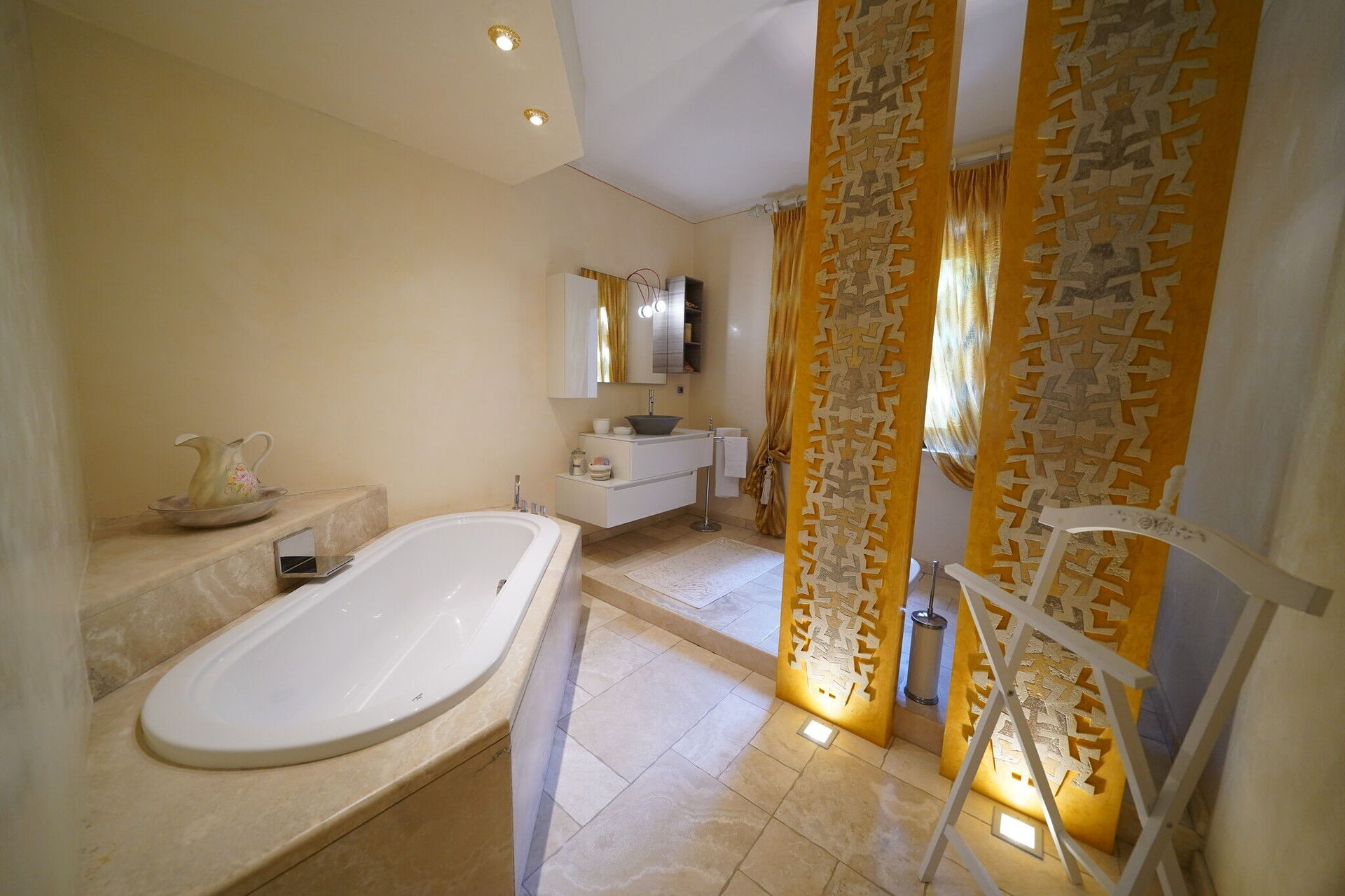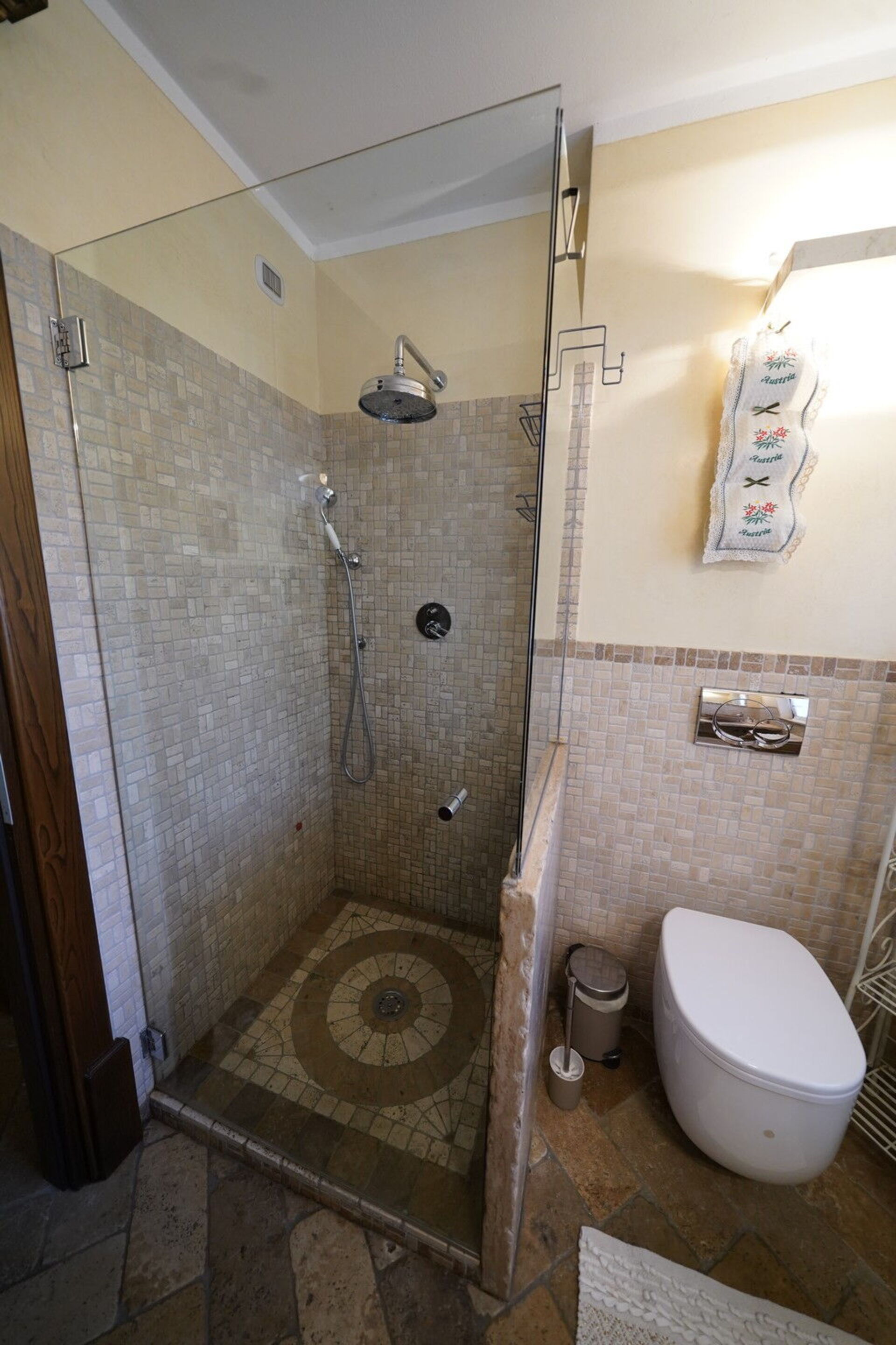 Al piano terra inferiore - con accesso separato senza scale dal parcheggio - una sorta di appartamento separato con cucina indipendente, forno per pizza, un letto matrimoniale, bagno con doccia, lavanderia. Qui non c'è aria condizionata perché questa parte della casa è più fresca. Al piano superiore aria condizionata ovunque.