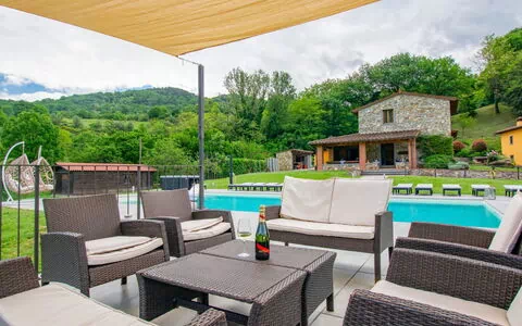 La proprietà è una casa colonica di 5 stanze con arredi confortevoli e di buon gusto. Il soggiorno presenta un camino aperto, ma è solo per decorazione e non funzionale. Le aree esterne includono una loggia, un giardino e una terrazza con sedie a sdraio, permettendoti di vivere appieno la splendida vista panoramica. Si noti che la capacità massima della proprietà non è esplicitamente indicata, ma dispone di due camere da letto e un bagno, solo un esempio dei dettagli dell'alloggio forniti.