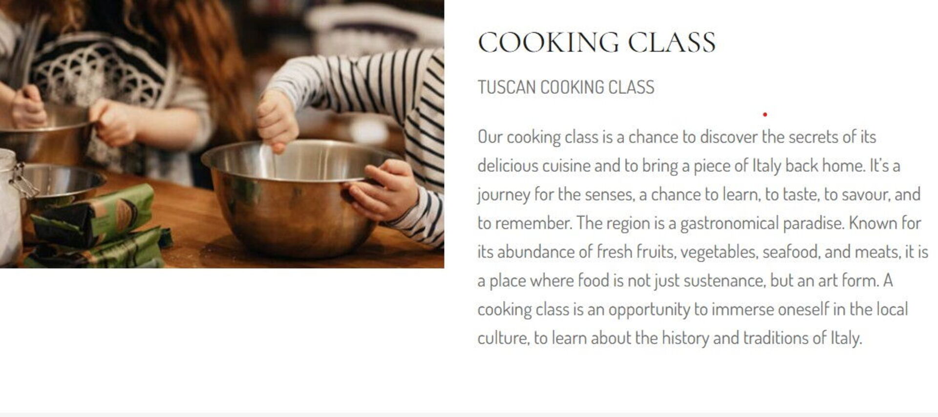 Lezioni di cucina - Impara le tecniche classiche per padroneggiare la cucina toscana in presenza di uno chef del luogo. Il proprietario può fissare un evento in cui uno chef si presenta alla proprietà per tenere una lezione di cucina per qualunque sia il numero di persone nel tuo gruppo che voglia partecipare. È un modo divertente per passare del tempo in compagnia di amici e famigliari mentre si imparano i segreti basilari per preparare deliziosi piatti toscani una volta tornati a casa propria. Non esitare a contattarci per ulteriori dettagli ed informazioni sui costi supplementari.