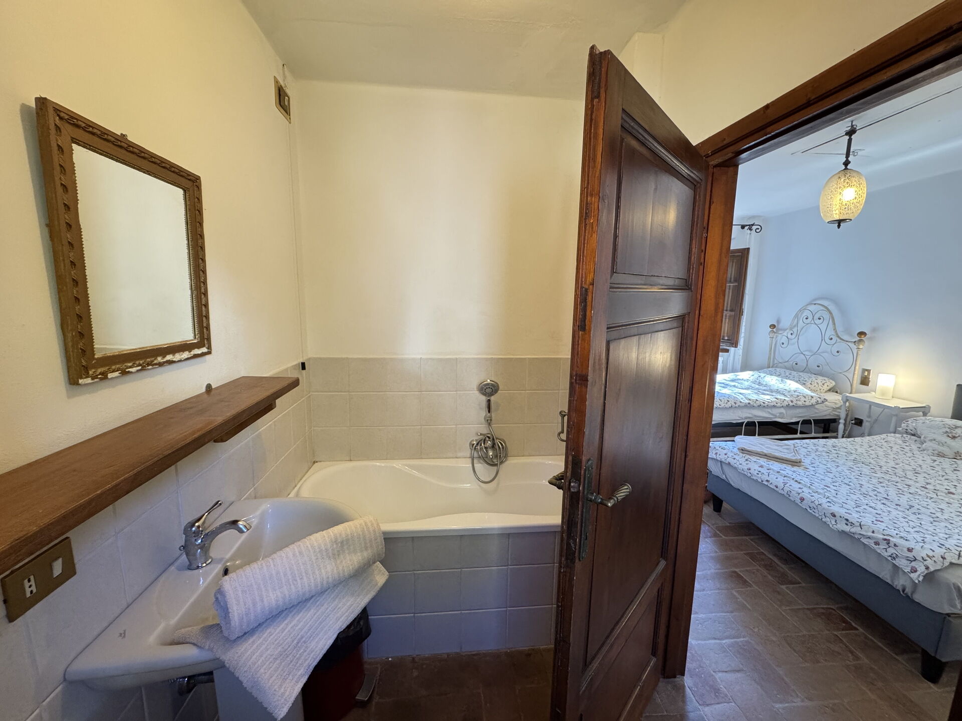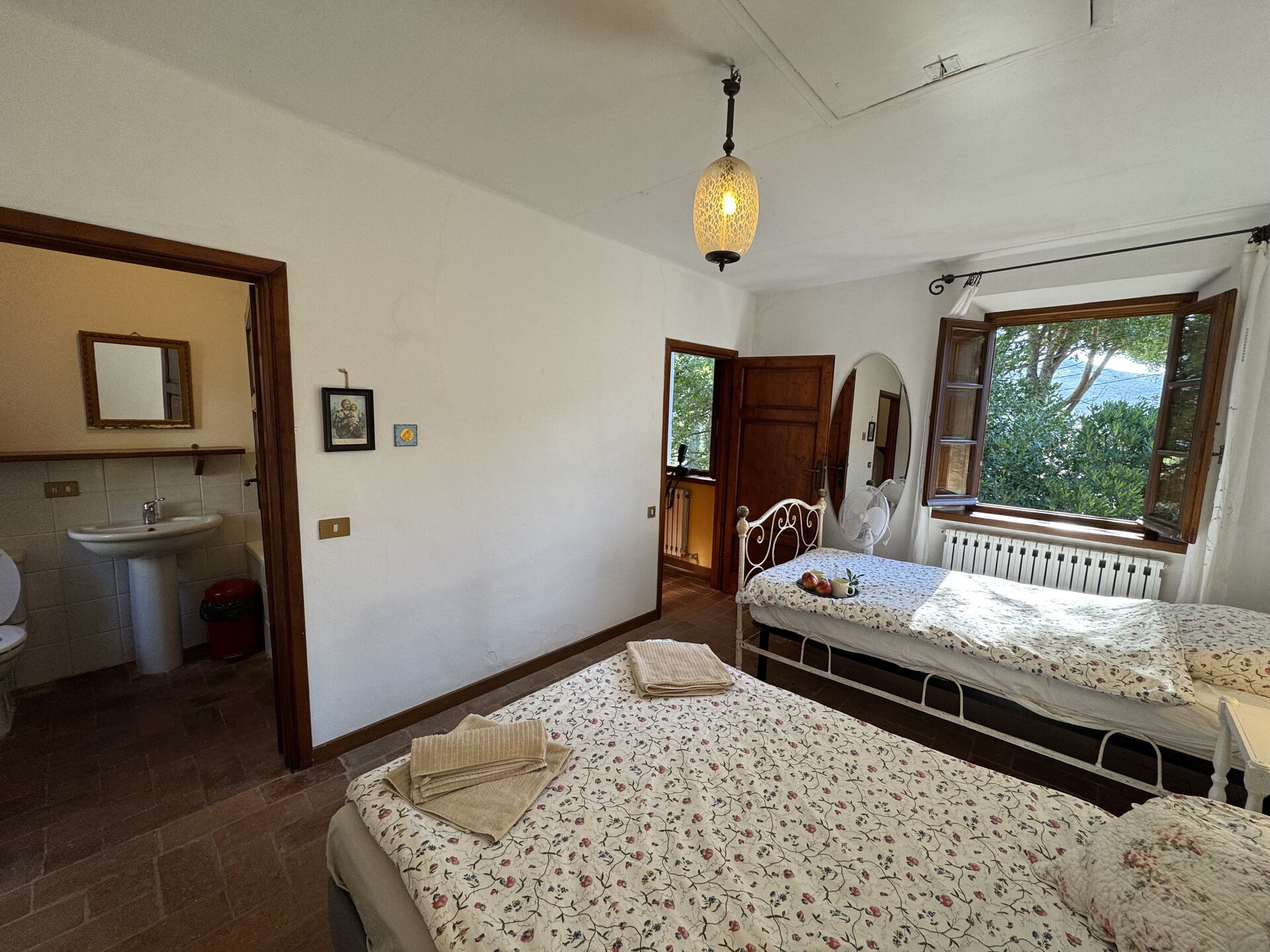 Camera da letto con bagno: letto singolo, letto alla francese, lavandino, wc, vasca da bagno.