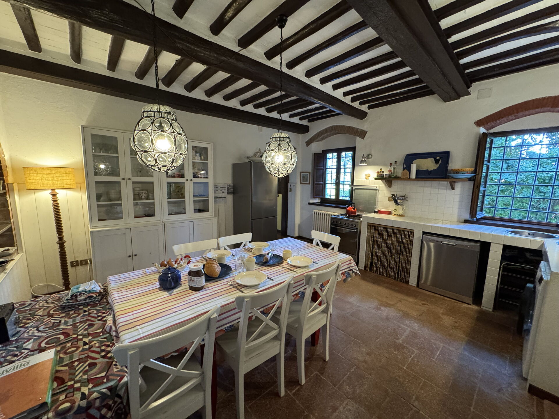 Cucina: tavolo da pranzo, lavastoviglie, frigo, freezer, forno, lavatrice, televisione, uscita sul giardino.