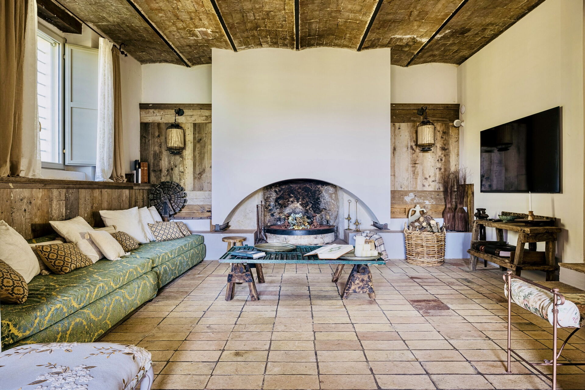 Soggiorno (30 m2): poltrona, caminetto, due divani letto (larghezza: 1m, lunghezza: 2m), aria condizionata, televisione, zanzariere.