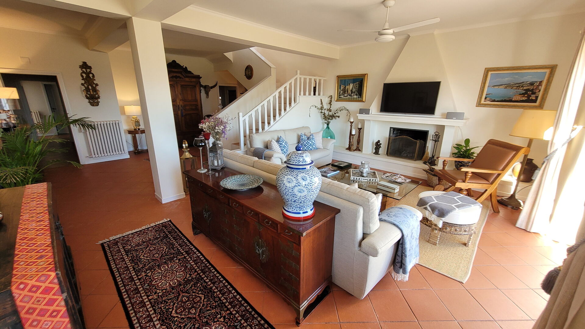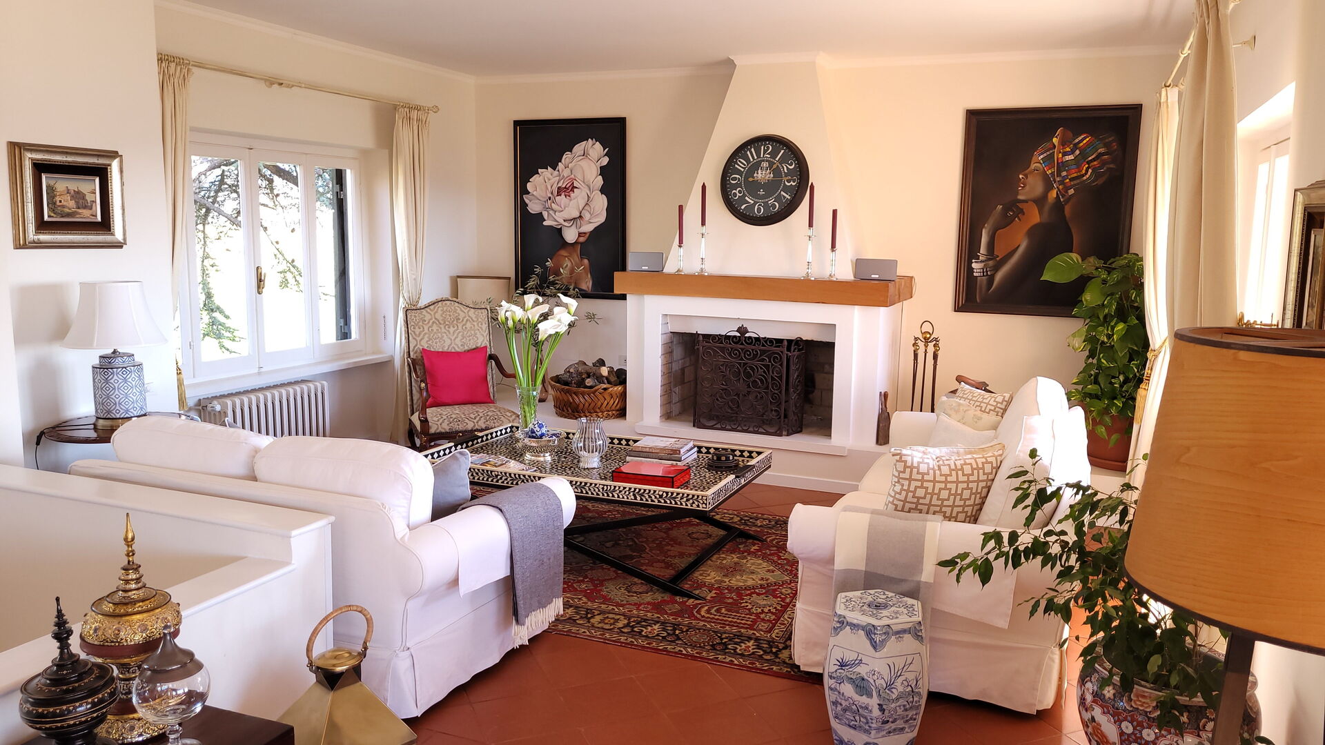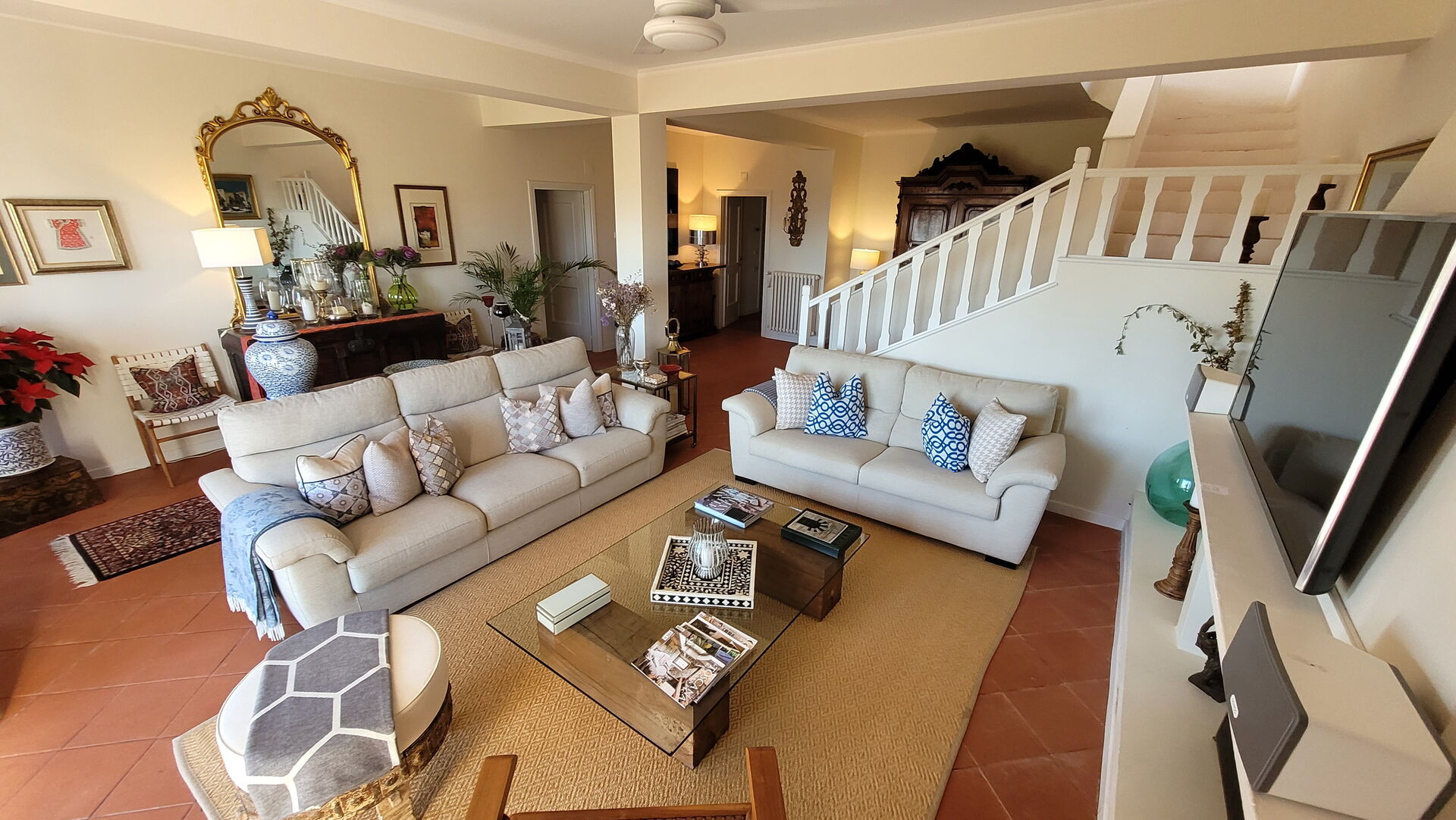 Soggiorno: due divani (persone: 8), caminetto, internet WIFI, internet, televisione, ventilatore a soffitto, zanzariere, uscita sul giardino.