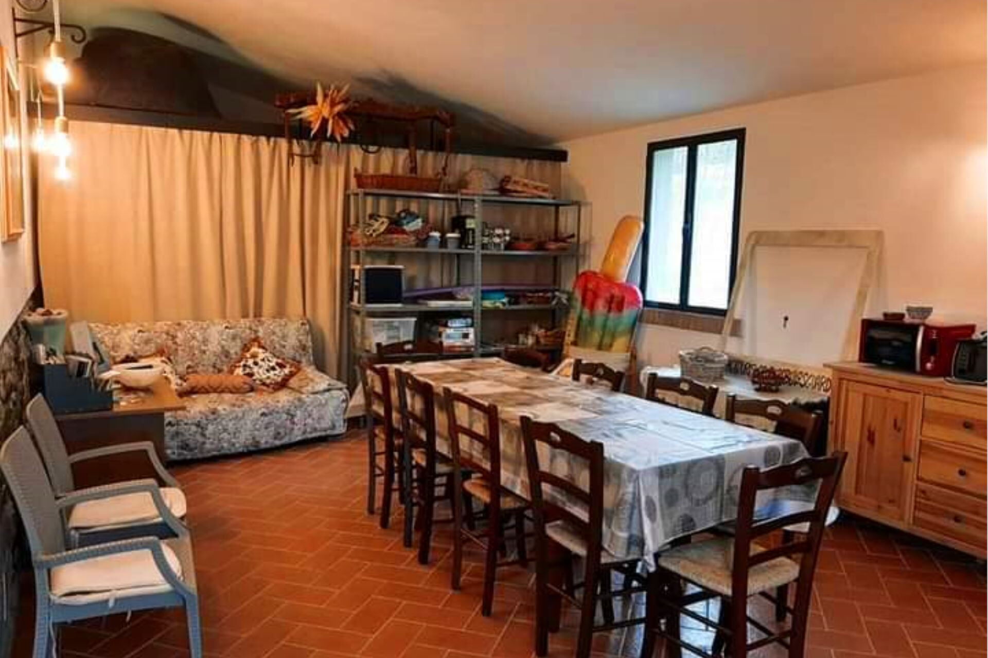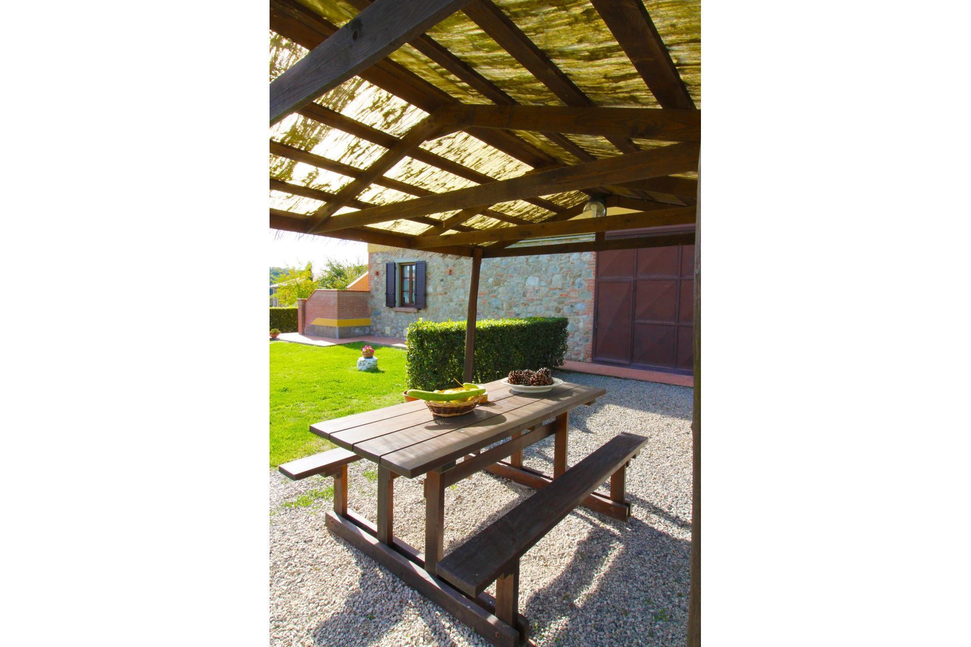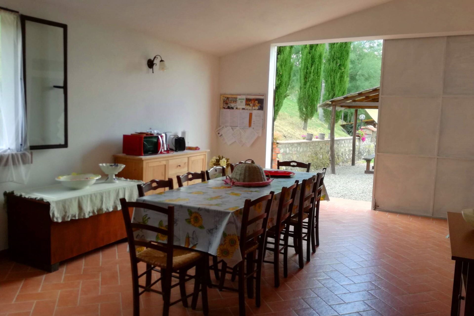 Nell'ampio spazio verde intorno al casolare trovate la bella piscina completamente recintata e ad uso privato delle dimensioni di m. 10x5, profondità m. 1,10-1,50 (aperta dal 01 Maggio al 30 Settembre). Nel giardino, per le vostre cene all’aria aperta e in compagnia un gazebo attrezzato, mobili da esterno e barbecue. A piano terra una comoda sala comune dotata di foro a microonde, tostapane, bollitore, frullatore e freezer, perfetta per le colazioni o per una serata tra amici.