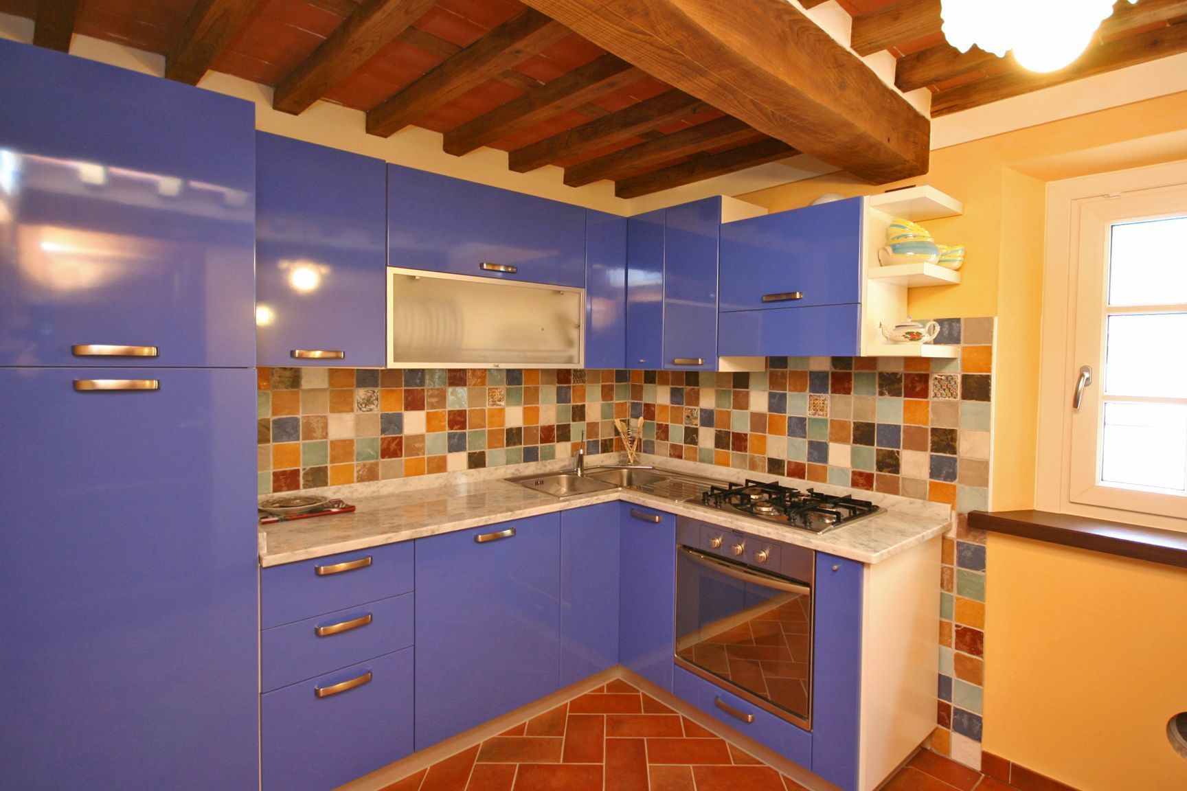 1° Piano: soggiorno (TV satellitare) con zona pranzo, cucina (forno, freezer, lavastoviglie), bagno con doccia.
