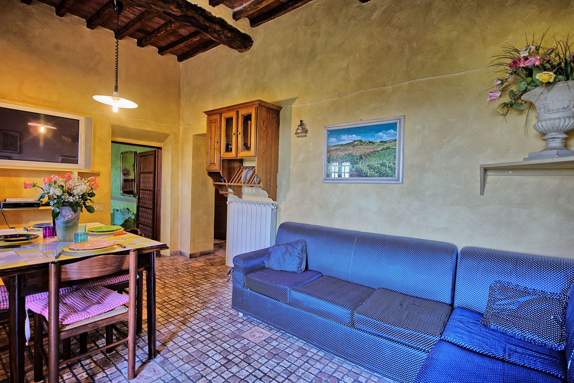 Piano terreno (si accede all’appartamento salendo 3 gradini): soggiorno (TV satellitare) con zona pranzo e angolo cottura (forno, lavastoviglie), bagno con doccia, camera matrimoniale con camino, disimpegno con frigorifero e lavatrice.