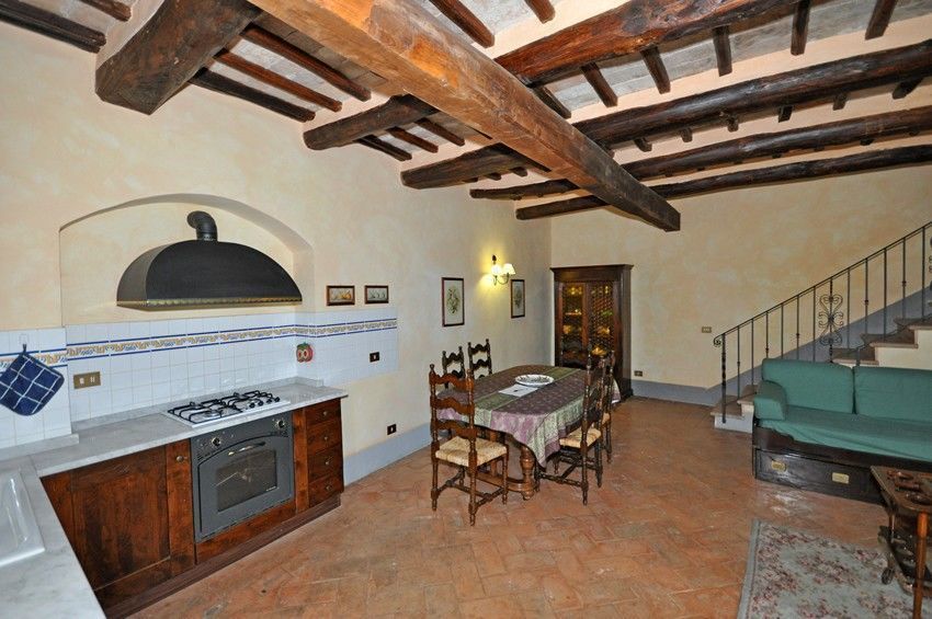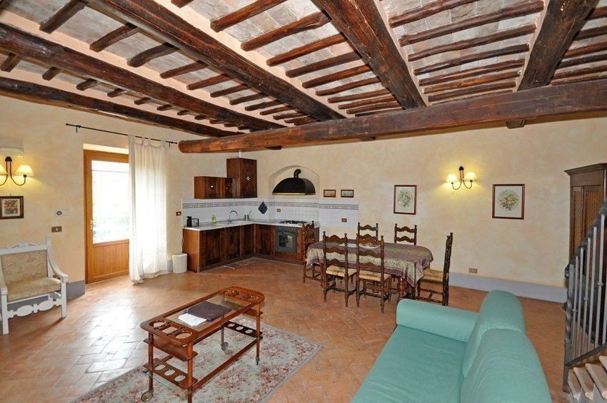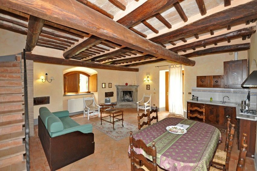 Piano terreno: ingresso su soggiorno (TV) con divano letto matrimoniale, camino, zona pranzo e angolo cottura (forno, freezer, lavastoviglie, tostapane).