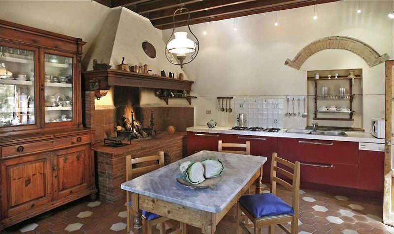 Piano terreno: ampio soggiorno con camino, zona pranzo con camino (TV, DVD), cucina (forno, freezer, lavastoviglie, microonde) con grande camino utilizzabile anche come barbecue e stufa a legna, WC, bagno con doccia (lavatrice).