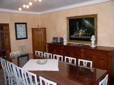 Dining room with large dining table and chairs up to 16 people.