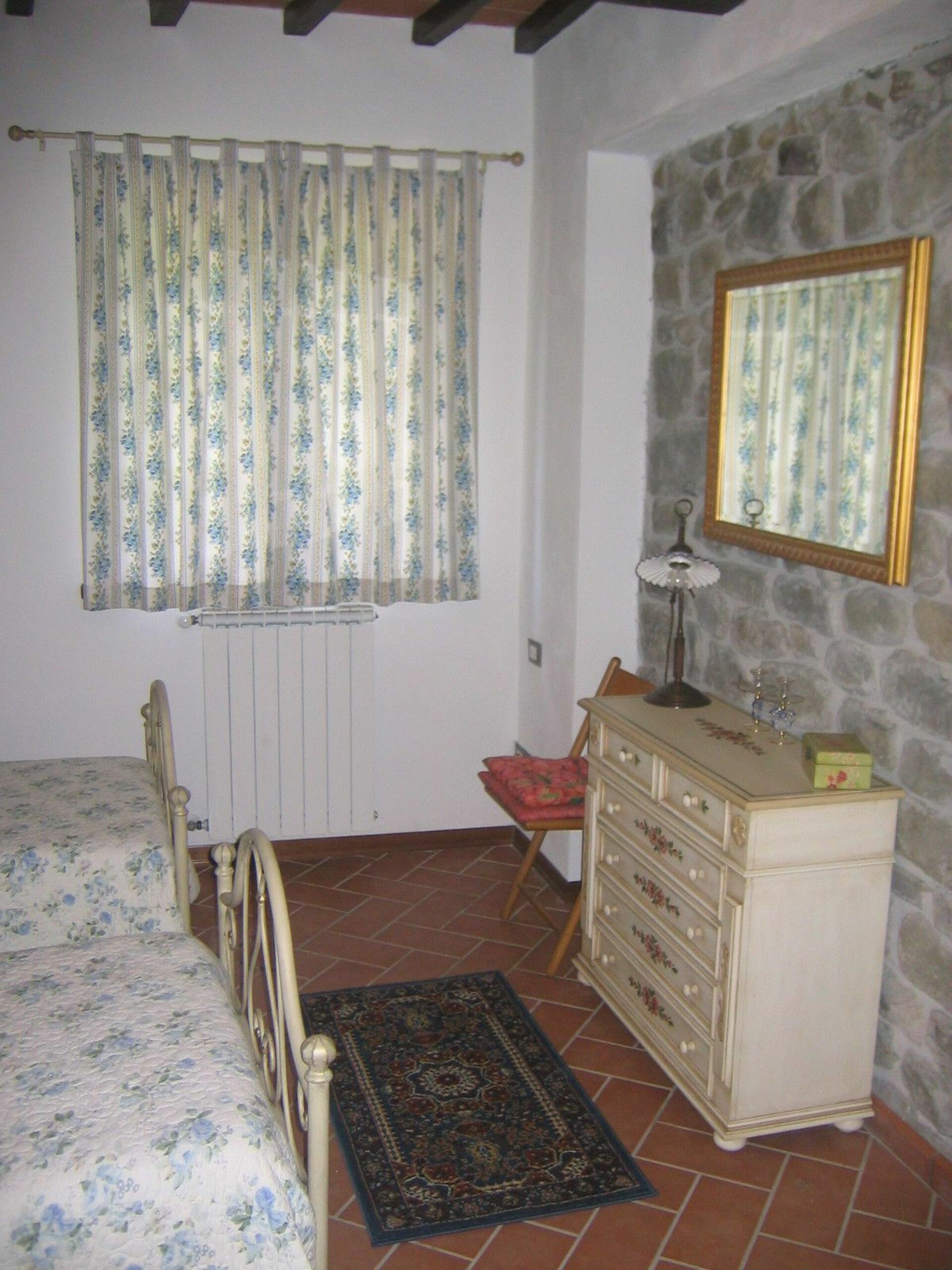 FIRST FLOOR On this floor there is a room with 2 single beds (Guests Room), it has hand painted furniture and plenty storage room. The stone walls, original, are the main feature and decoration of this comfortable room. Located on this level is the main bathroom which has a Shower/Bathtub, decorated with majolica tiles. On the same floor is a studio-room with 2 single beds.