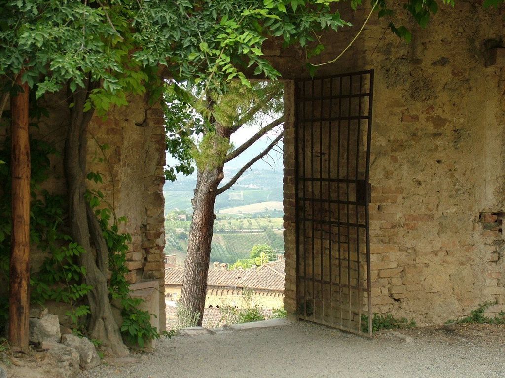 from the hilltop olive grove in San Gimignano, Tuscany, this view through the walls and overlooking the surrounding landscape evokes the serenity and timeless beauty of the region.