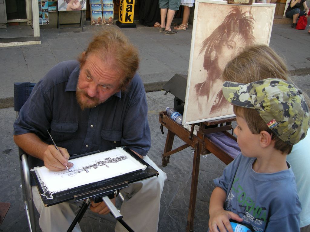 Impressionnant, ce peintre installé dans la galerie des Offices à Florence, juste avant le Ponte Vecchio. Sa moustache vous dit quelque chose ?