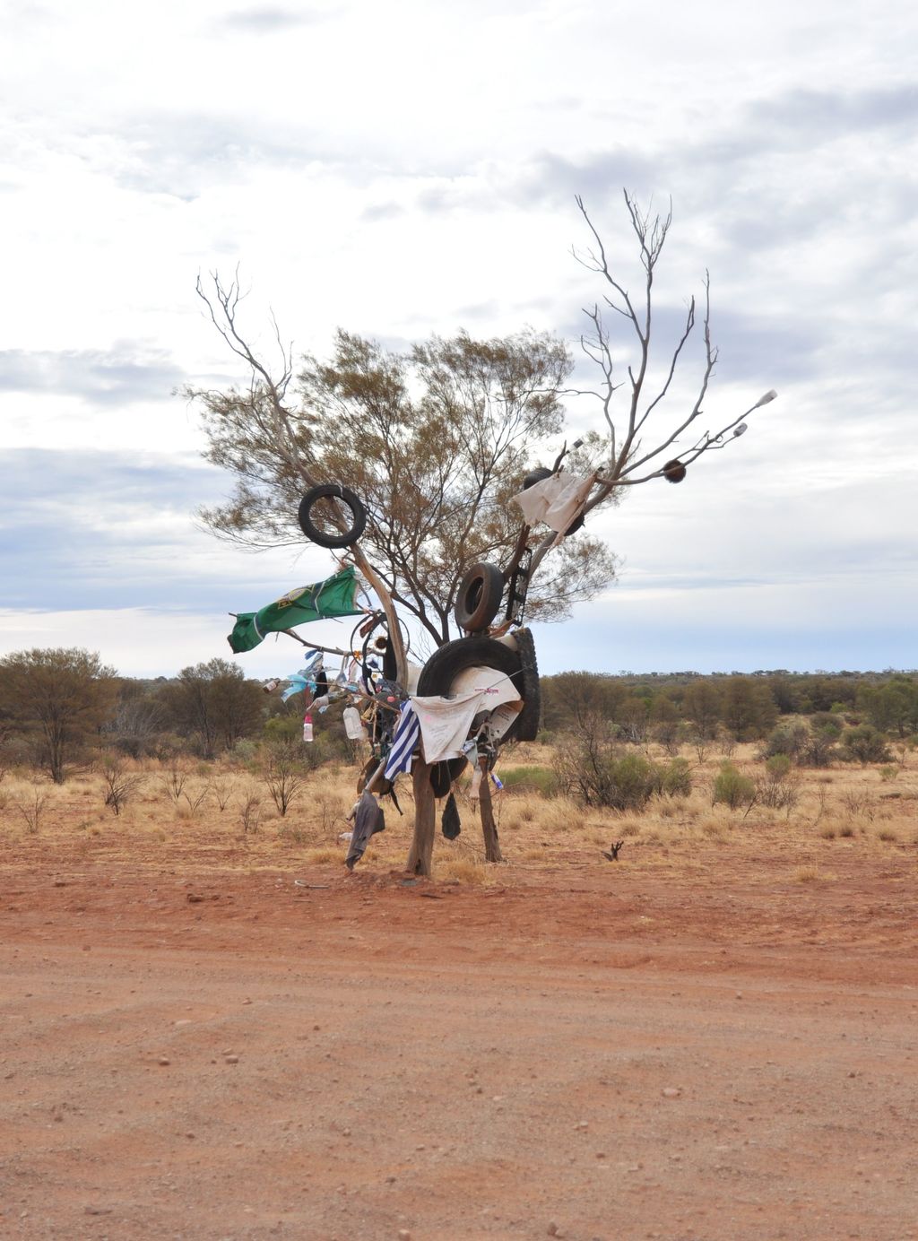La strada che attreversa in deserto del centro rosso australiano non è priva di insidie, su quest'albero sono appesi i rottami delle auto che hanno avuto problemini...