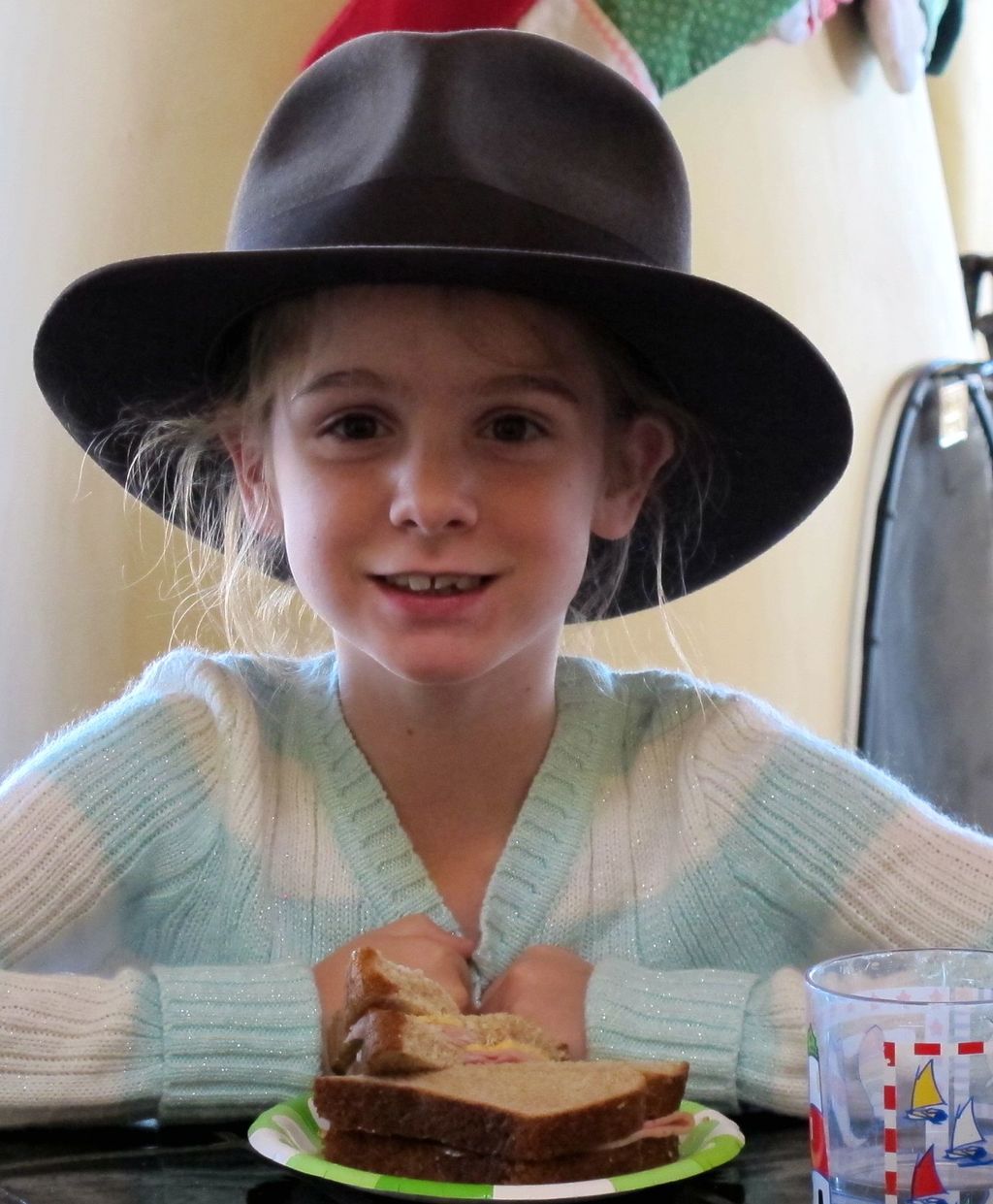On vacation with our grand daughter Sasha. We were having lunch when she grabbed this hat and put it on.