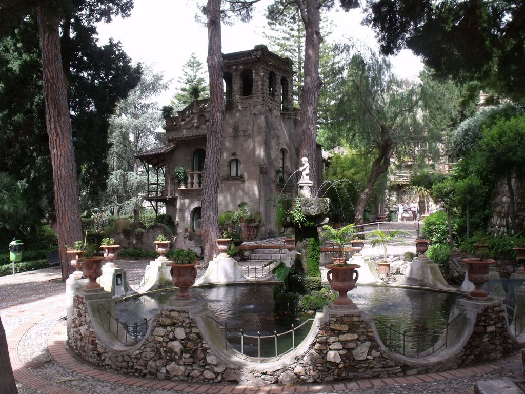 The beautiful gardens at Taormina, Sicily which overlook the sea with a view of Mount Etna