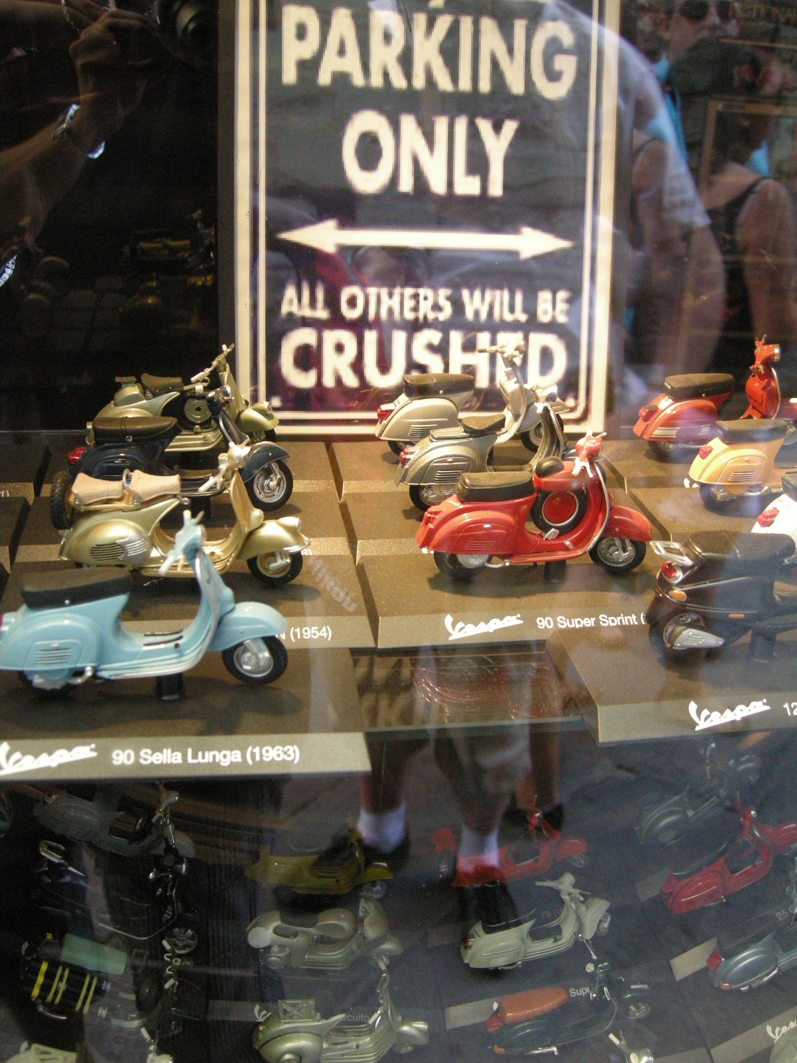 Sur cette photo, le photographe est présent: reflété dans la vitrine et absorbé par les mythiques vespas.