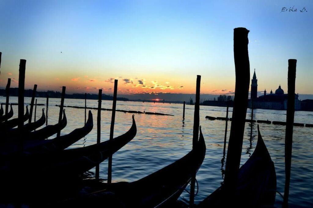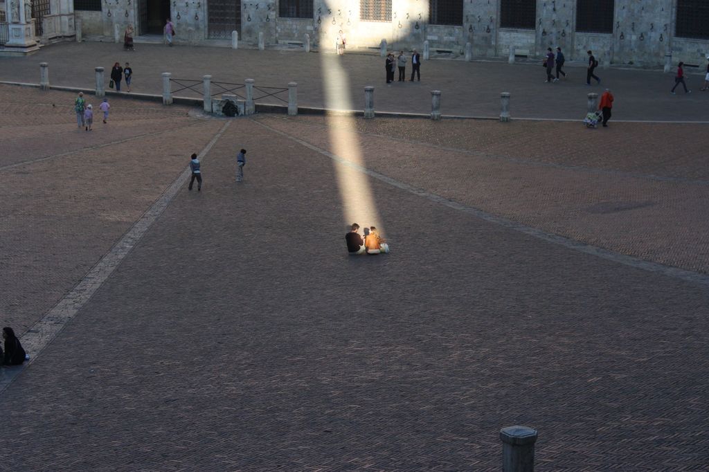 The setting sun un shines through the tower, casting light on a couple in the Piazza del Campo, Siena