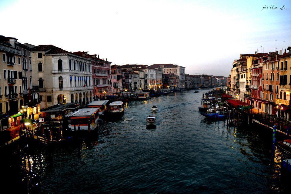 visuale dal ponte di rialto mentre il sole sorge e cresce sempre di più nel cielo. Venezia.