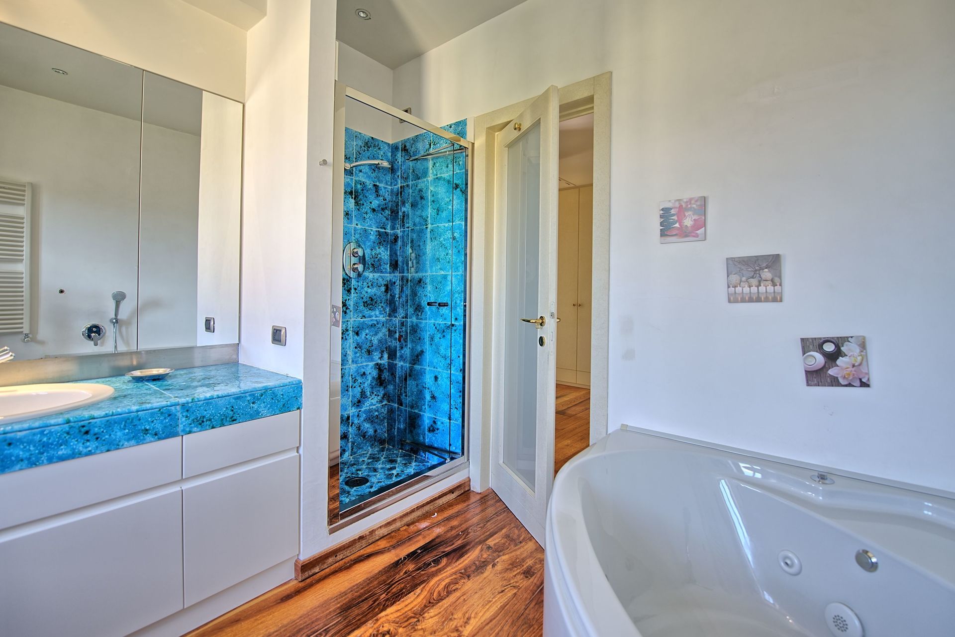 Second floor: double bedroom, bathroom with hydro massage bath and shower, bathroom with shower, twin bedroom, double bedroom, bathroom with shower, double bedroom with private bathroom with shower.