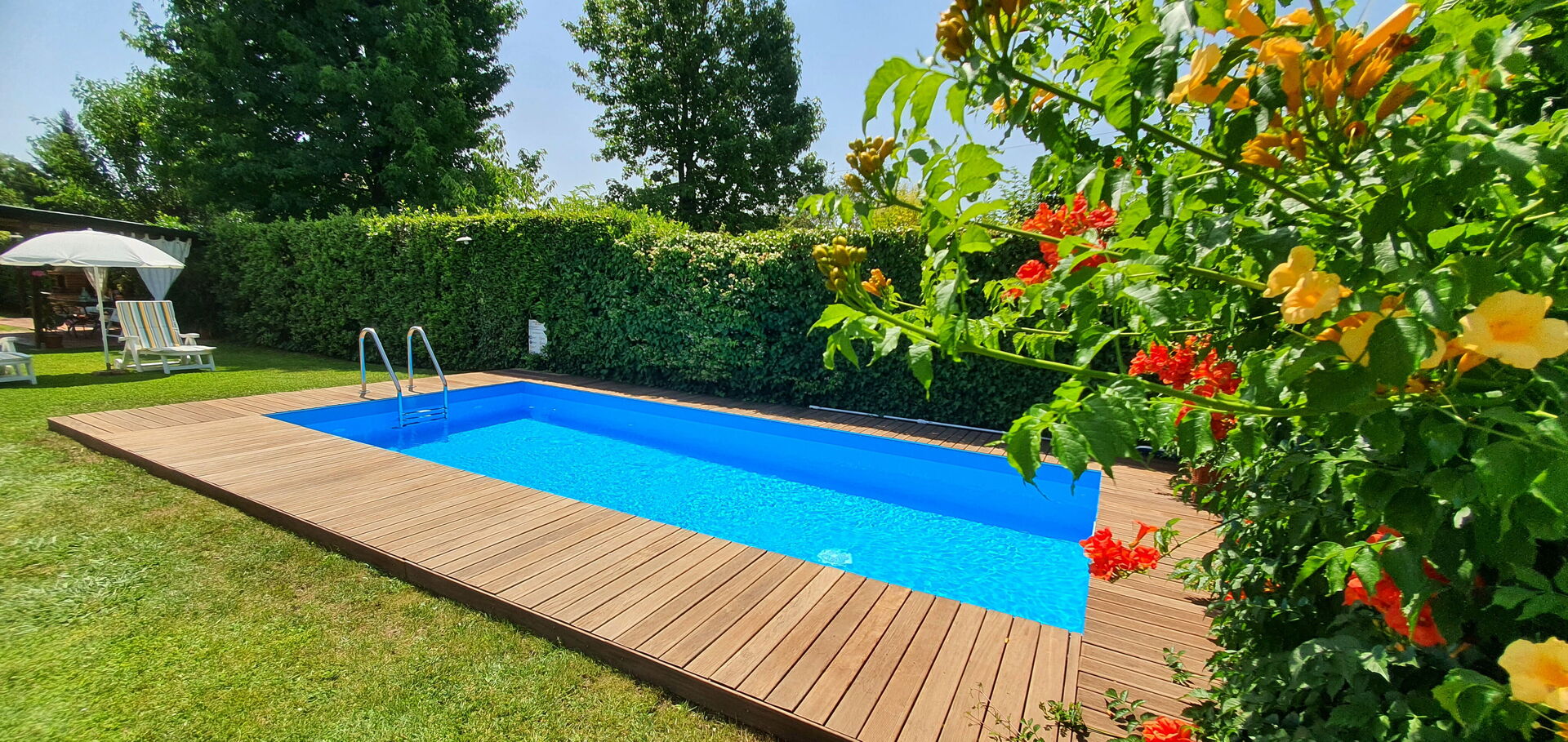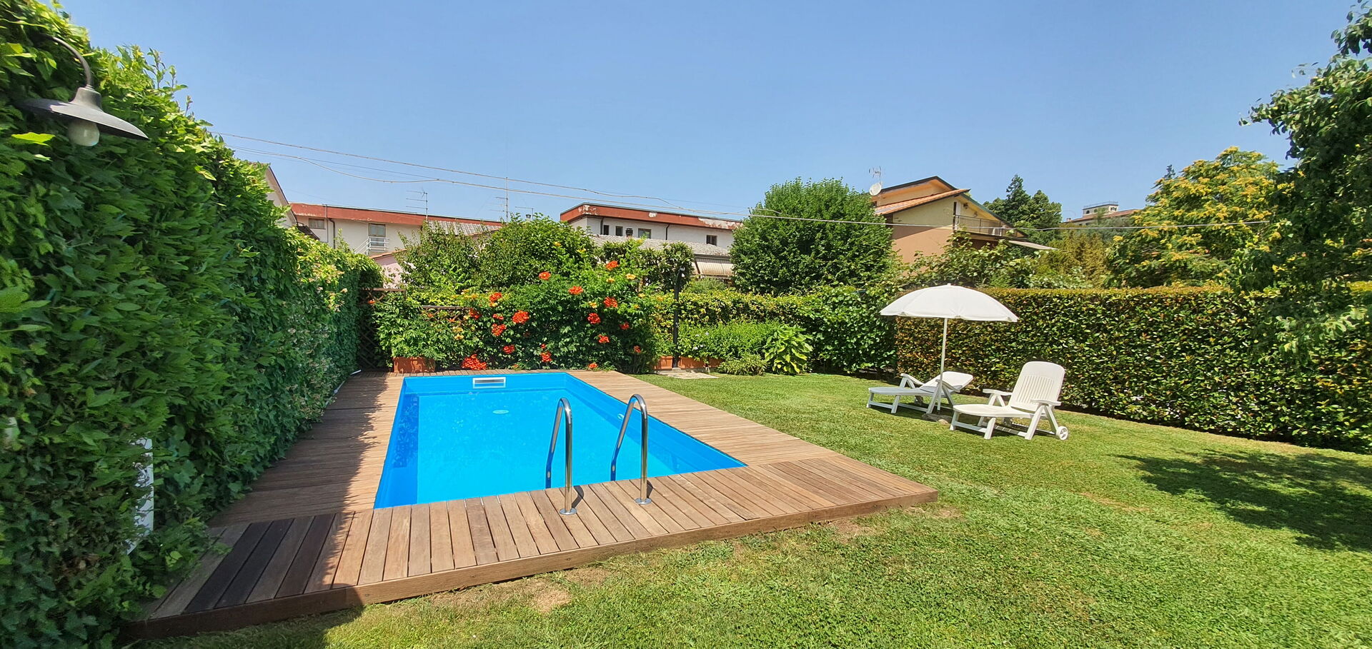 Garden: swimming pool (length: 6.6m, width: 2.8m, depth: 1.2m), barbecue, al fresco dining, dining table (people: 6), garden furniture, four sunbeds.