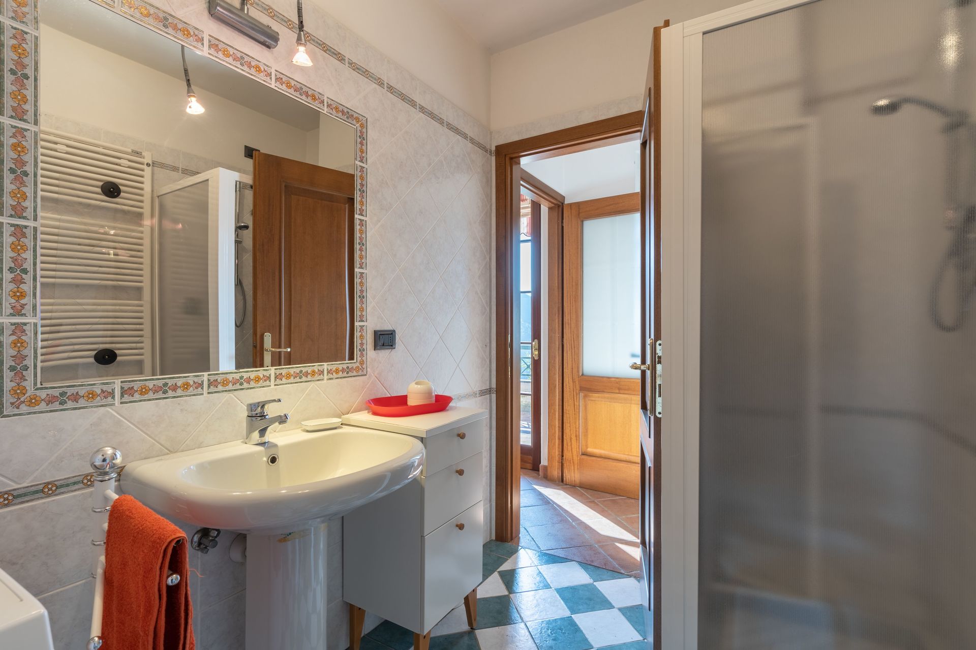 Bathroom: basin, toilet, bidet, shower.
