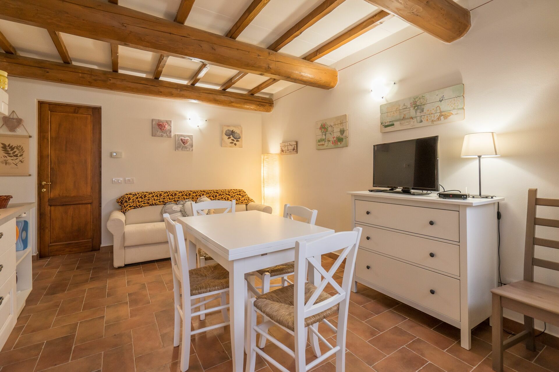 Kitchen + living room: well equipped kitchen, dining table (people: 4), fridge, microwave, stove top, american coffee machine, sofa (people: 3), WIFI internet, satellite tv, exit to the terrace.