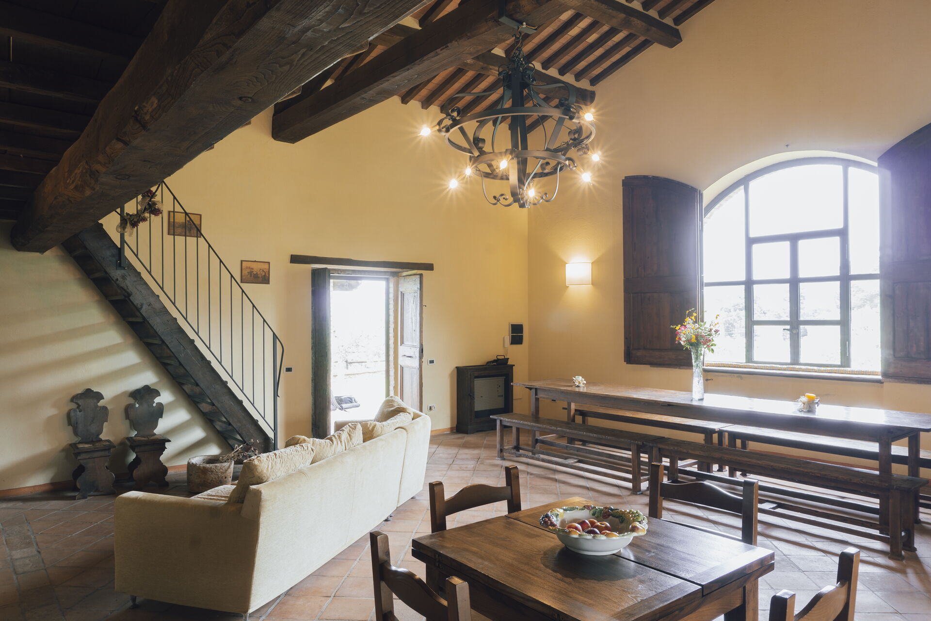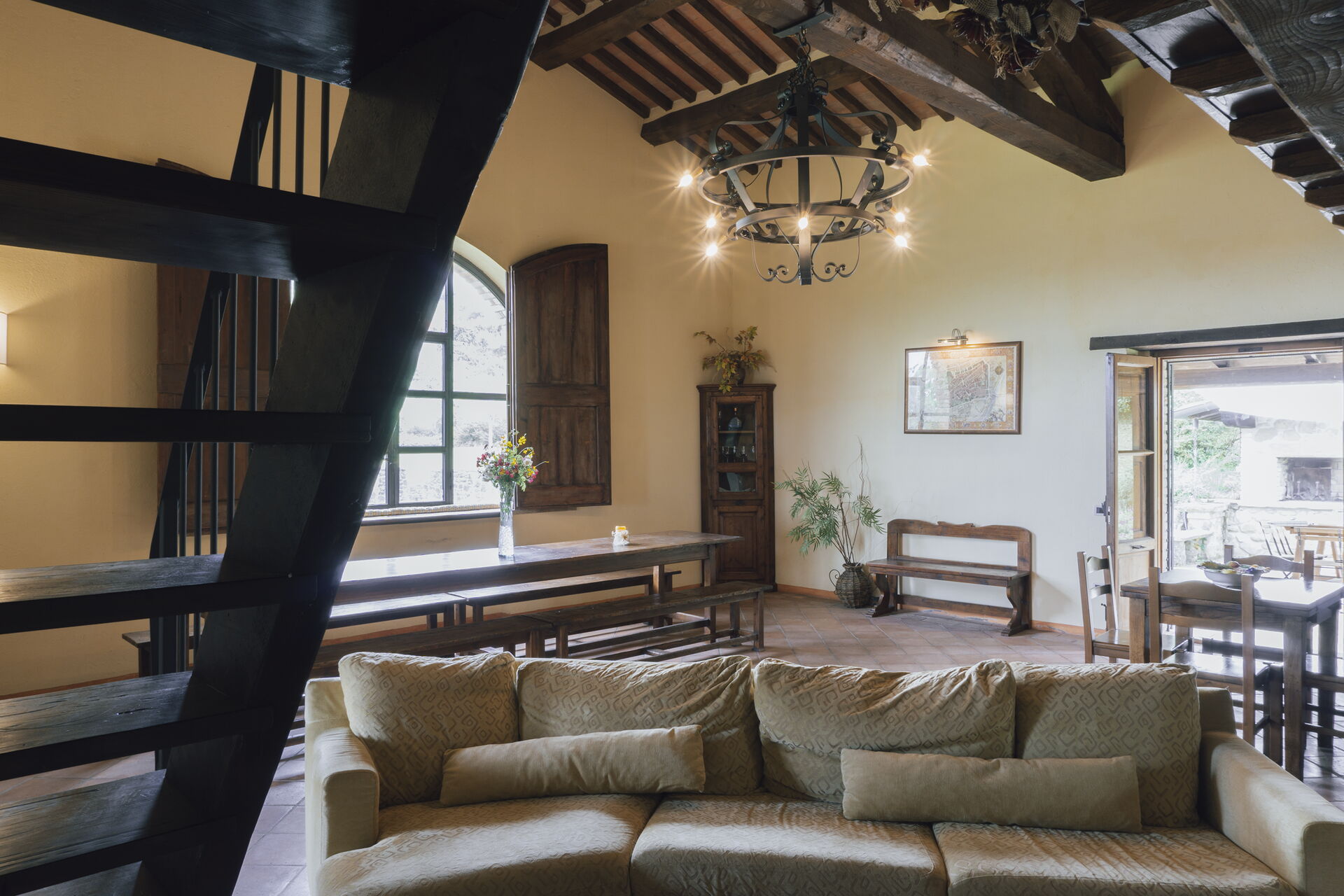 Kitchen + living room: two dining tables (people: 12), dishwasher, fridge, freezer, microwave, stove top, oven, toaster, italian coffee machine, sofa, fireplace, WIFI internet, television.