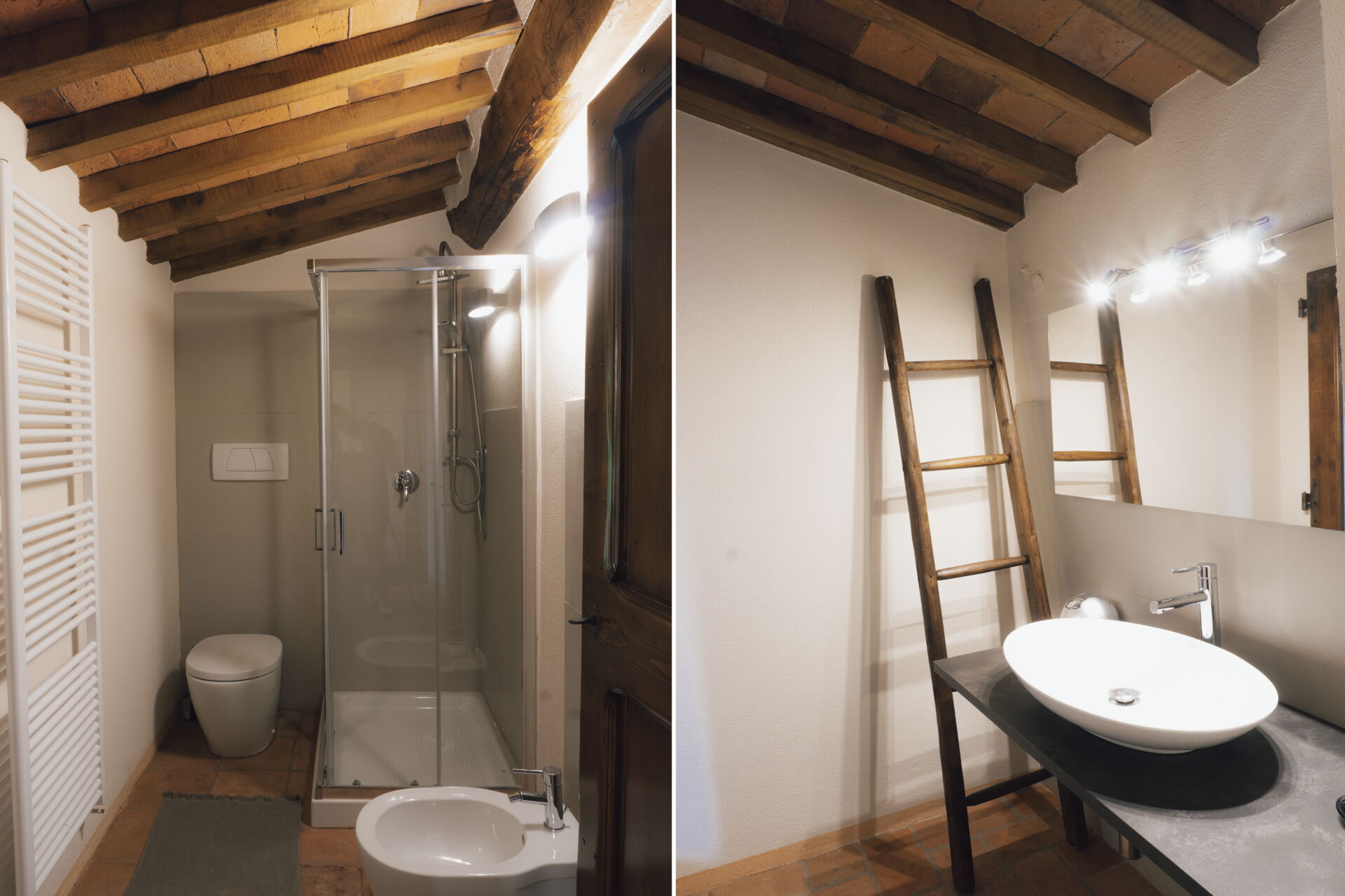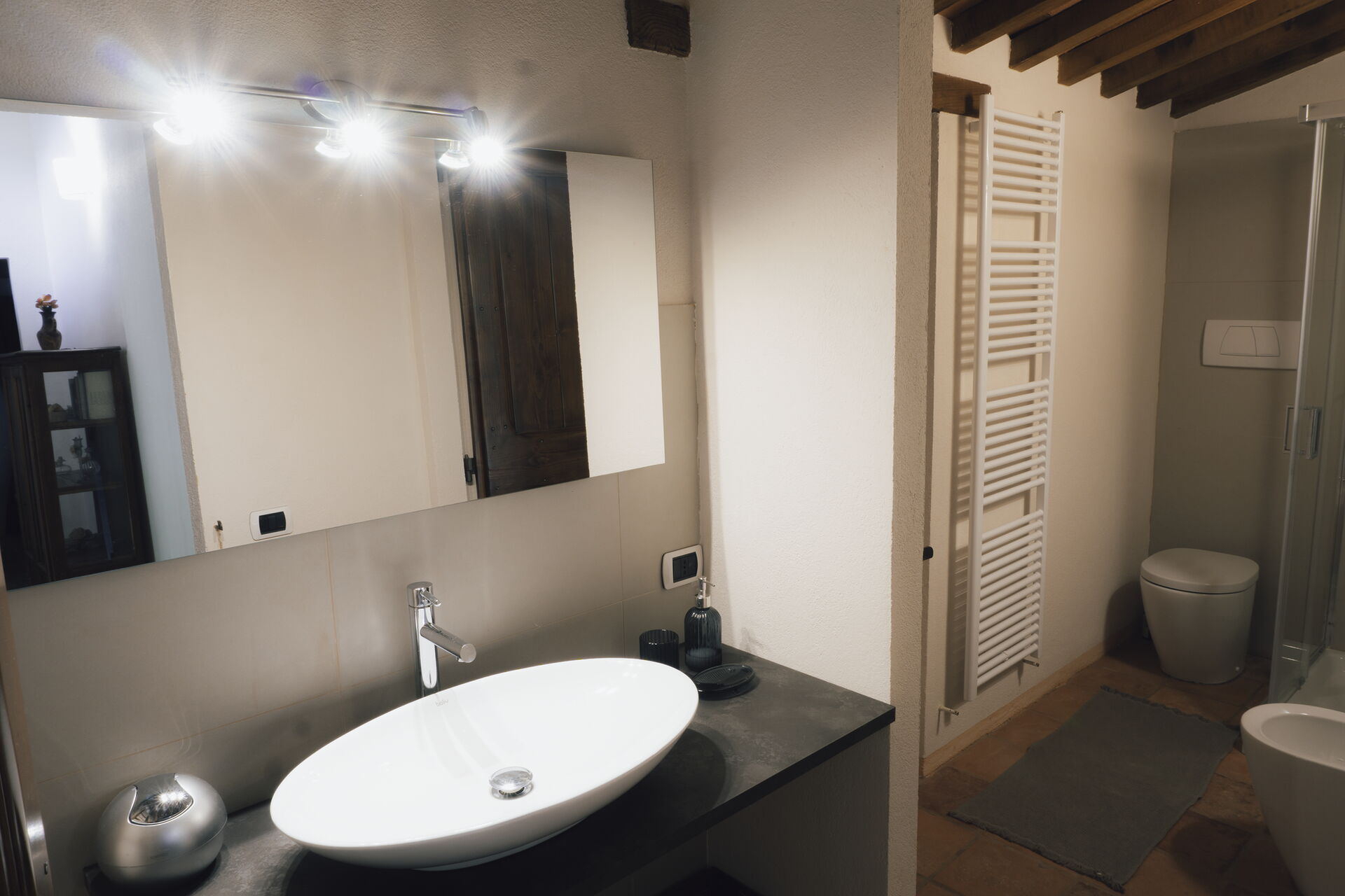 Bathroom: basin, toilet, bidet, shower.