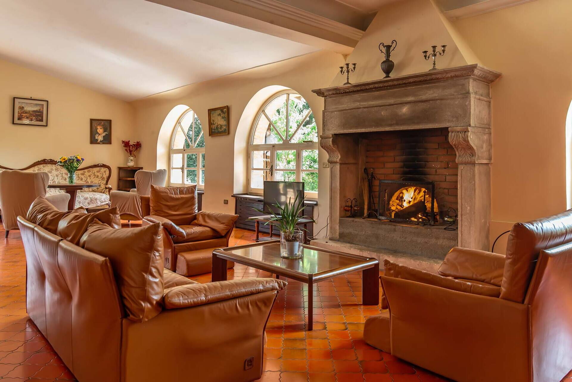 Living room (120 m2): sofa, working desk, fireplace, dining table (people: 14), WIFI internet, television, exit to the garden.