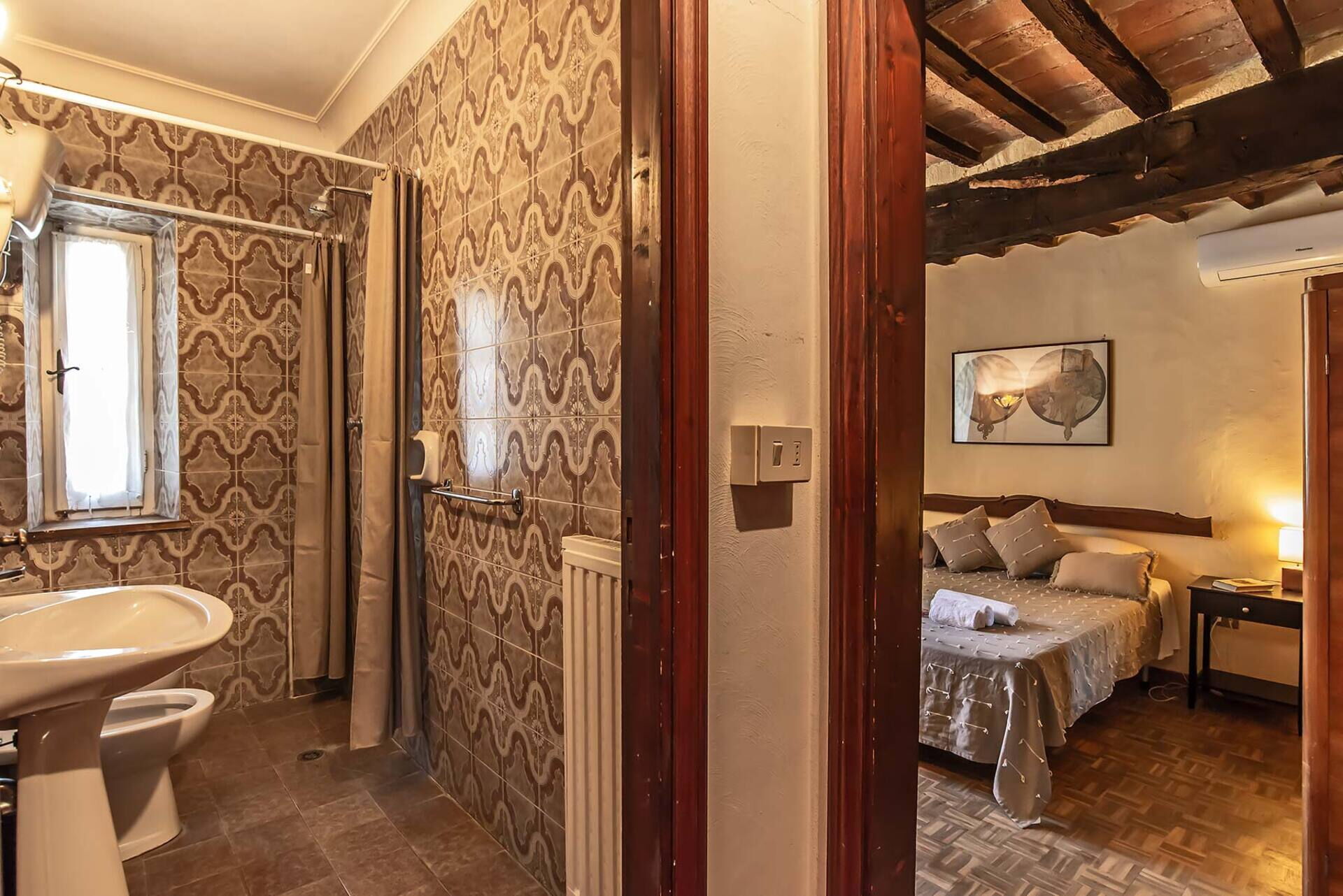 Bedroom + Ensuite Bathroom 5 (13 m2): double bed, baby crib, WIFI internet, air conditioning, mosquito net, television, portable fan, basin, toilet, bidet, shower, hairdryer, exit to the terrace.